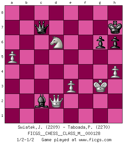 Last move : 1/2-1/2 2024 March 24 4:57:59 [Event "FICGS__CHESS__CLASS_M__000128"] [Site "FICGS"] [Date "2023.09.25"] [Round "1"] [White "Swiatek,Janusz"] [Black "Taboada,Pedro Pablo"] [Result "1/2-1/2"] [WhiteElo "2209"] [BlackElo "2270"] 1.e4 e5 2.Nf3 Nc6 3.Bb5 a6 4.Ba4 Nf6 5.O-O Be7 6.Re1 b5 7.Bb3 O-O 8.c3 d6 9.h3 Bb7 10.d4 Re8 11.Nbd2 Bf8 12.a4 h6 13.Ba2 Qd7 14.Bb1 Rad8 15.d5 Ne7 16.b3 c6 17.c4 Rb8 18.Nf1 bxc4 19.bxc4 a5 20.N3d2 Ba6 21.Ne3 Ng6 22.Nb3 cxd5 23.cxd5 Nf4 24.Bc2 Rb4 25.Nf5 g6 26.Bxf4 exf4 27.Nfd4 Bg7 28.Nc6 Nh7 29.Nbxa5 Bxa1 30.Qxa1 Ng5 31.Qc3 Rbxe4 32.Bxe4 Nxe4 33.Qb4 Nc5 34.Rxe8+ Qxe8 35.Qxf4 Qe1+ 36.Kh2 Ne4 37.Nd8 Nd2 38.Qxf7+ Kh8 39.Qf6+ Kh7 40.h4 Nf1+ 41.Kh3 Bd3 42.Nf7 Bf5+ 43.g4 Bxg4+ 44.Kg2 Ne3+ 45.fxe3 Qd2+ 46.Qf2 Qxd5+ 47.Kh2 Bf5 48.Nc4 Qxf7 49.Nxd6 Qc7 50.Qd2 Be4 51.Kg3 Bc2 52.a5 1/2-1/2 Follow this game move after move (download)The most powerful weapon in Chess is to have the next move. (David Bronstein) Ja, ich habe einmal eine Blitzpartie gespielt, es war in einem Zug, 1929. --im Interview 1989 (Mikhail Moiseyevich Botvinik) Yo no creo en la psicología. Yo creo en las buenas movidas. (Bobby Fischer) Vous m'avez demandé de vous exposer quel est le fondement de la prière. Je ne fais que préparer les pièces du jeu sur la table... Nous sera-t-il permis d'en adopter les règles et si nous les appliquons scrupuleusement nous ne tarderons pas à faire mat le Roi divin ! Il ne pourra échapper à nos mains. (Sainte Thérèse d'Avila, Chemin de perfection) Do not put your faith in what statistics say until you have carefully considered what they do not say. (William W. Watt)