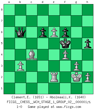 Last move : 1-0 2006 September 7 18:57:30 [Event "FICGS__CHESS__WCH_STAGE_1_GROUP_02__000001 "] [Site "FICGS"] [Date "2006.07.01"] [Round "1"] [White "Clement,Etienne"] [Black "Abolmaali,Kayvan"] [Result "1-0"] [WhiteElo "1651"] [BlackElo "1640"] 1.d4 Nf6 2.c4 c5 3.d5 b5 4.cxb5 a6 5.bxa6 Bxa6 6.Nc3 d6 7.Nf3 g6 8.g3 Bg7 9.Bh3 Nbd7 10.O-O O-O 11.Qc2 Nb6 12.Rd1 Bc4 13.e4 Qc7 14.a4 Rfb8 15.Bg5 Nxa4 16.Rxa4 Bb3 17.Qxb3 Rxb3 18.Rxa8+ Rb8 19.Rda1 Qb7 20.Rxb8+ Qxb8 21.Bc1 h5 22.Bf1 Bh8 23.Ra3 Nd7 24.Nb5 Ne5 25.Nxe5 Bxe5 26.Ra7 Bf6 27.b3 g5 28.e5 Bxe5 29.Bxg5 f6 30.Bh6 Kf7 31.Be2 Kg6 32.Be3 Qg8 33.Bc4 Qf8 34.f4 Bb2 35.Ra2 Bd4 36.Bxd4 cxd4 37.Nxd4 Qd8 38.Kg2 Qb6 39.Nf5 e5 40.dxe6 Kxf5 41.Re2 1-0 Benko gambit accepted Kingside Castling by player White (move 10) Kingside Castling by player Black (move 10) Player White won this chess game. Follow this game move after move (download)He who fears an isolated Queen's Pawn should give up Chess. (Siegbert Tarrasch) Das Zentrum ist der Balkan des Schachbretts - Kriegshandlungen können in jedem Moment ausbrechen. (Aaron Nimzowitsch) Aún el Rey más flojo huye despavorido ante la amenaza de un Jaque doble. (Aaron Nimzowitsch) Le moment que je préfère le plus dans une rencontre, c'est celui où je sens que la personnalité de l'adversaire se brise. (Robert Fischer) May I never be complete. May I never be content. May I never be perfect. Deliver me, Tyler, from being perfect and complete. (Chuck Palahniuk, Fight Club)