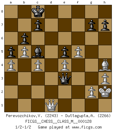 Last move : 1/2-1/2 2024 March 6 14:37:0 [Event "FICGS__CHESS__CLASS_M__000128"] [Site "FICGS"] [Date "2023.09.25"] [Round "1"] [White "Perevozchikov,Vjacheslav"] [Black "Duttagupta,Aniruddha"] [Result "1/2-1/2"] [WhiteElo "2243"] [BlackElo "2266"] 1.Nf3 d5 2.c4 d4 3.b4 f6 4.d3 e5 5.a3 a5 6.b5 Nd7 7.e3 dxe3 8.fxe3 b6 9.Be2 Bb7 10.Nc3 f5 11.O-O Bd6 12.e4 Ngf6 13.exf5 Qe7 14.Ng5 Bc5+ 15.Kh1 Bd4 16.Bd2 Nc5 17.Bf3 Bxf3 18.Qxf3 O-O-O 19.Rad1 Kb8 20.Nce4 Nfxe4 21.Nxe4 Nxe4 22.dxe4 Bc5 23.a4 Rd4 24.Qe2 Rhd8 25.Bc3 Rxd1 26.Rxd1 Bd4 27.Be1 Qa3 28.Bh4 Rd7 29.Qc2 Kc8 30.Rd3 Qa1+ 31.Rd1 Qa3 32.h3 Bc5 33.Rxd7 Kxd7 34.Qd1+ Kc8 35.Kh2 Qe3 1/2-1/2 Follow this game move after move (download)Bobby Fischer is the greatest Chess player who has ever lived. (Ken Smith) Unter Putin wird alles Geld aus Russland wie von einem Staubsauger nach Moskau umgeleitet, das ist wie ein schwarzes Loch. (Garry Kasparov) El Peón aislado arroja penumbra sobre todo el tablero. (Aaron Nimzovich) Lorsque vous vous retrouvez devant une position atroce, ne tendez pas un ultime piège dérisoire avec l'intention d'abandonner si l'adversaire le déjoue ! Faites-vous plutôt un devoir de résister comme si votre vie en dépendait. Jouez le coup qui vous déplairait au centuple si vous étiez dans la peau de votre tortionnaire ! If you work for a living, why do you kill yourself working ? (Tuco to a chicken in The Good, The Bad and The Ugly)