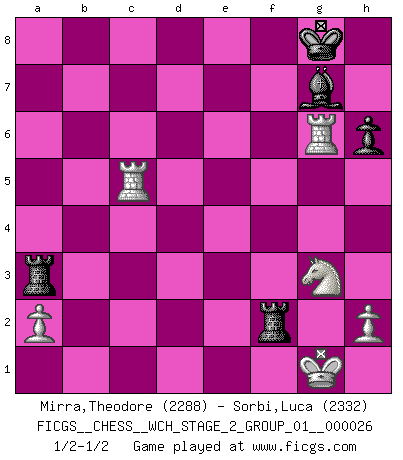 Last move : 1/2-1/2 2023 December 13 17:41:14 [Event "FICGS__CHESS__WCH_STAGE_2_GROUP_01__000026"] [Site "FICGS"] [Date "2023.10.03"] [Round "1"] [White "Mirra,Theodore"] [Black "Sorbi,Luca"] [Result "1/2-1/2"] [WhiteElo "2288"] [BlackElo "2332"] 1.d4 Nf6 2.c4 e6 3.Nf3 d5 4.Nc3 c6 5.Bg5 h6 6.Bxf6 Qxf6 7.e3 g6 8.Bd3 dxc4 9.Bxc4 Nd7 10.O-O Bg7 11.Qc2 Qe7 12.Ne4 O-O 13.Bb3 a5 14.Rac1 Nf6 15.Ng3 Bd7 16.e4 a4 17.Bc4 b6 18.e5 Nd5 19.Rfd1 a3 20.bxa3 Qxa3 21.Bb3 c5 22.dxc5 bxc5 23.Bxd5 exd5 24.Rxd5 Bc6 25.Rxc5 Bxf3 26.gxf3 Qxf3 27.Re1 Ra3 28.e6 fxe6 29.Rxe6 Qxf2+ 30.Qxf2 Rxf2 31.Rxg6 1/2-1/2 Follow this game move after move (download)I believe that Chess possesses a magic that is also a help in advanced age. A rheumatic knee is forgotten during a game of Chess and other events can seem quite unimportant in comparison with a catastrophe on the chessboard. (Vlastimil Hort) Frage: Was machen Sie mit den Preisen? Anwort: Ich habe Angst, dass meine Freundin davon neue Kleider kauft. (Loek van Wely) El Ajedrez es despiadado: debes de estar preparado para matar gente. (Nigel Short) Vouloir jouer aux échecs contre soi-même est aussi paradoxal que vouloir marcher sur son ombre. (Stefan Zweig) A government big enough to give you everything you want is strong enough to take everything you have. (Thomas Jefferson)