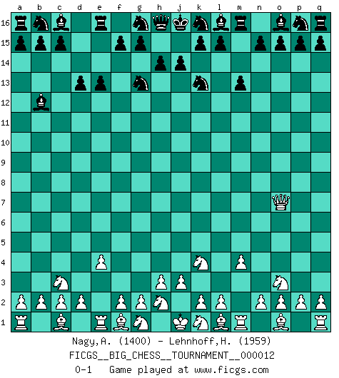Last move : 0-1 2007 October 15 6:42:0 [Event "FICGS__BIG_CHESS__TOURNAMENT__000012"] [Site "FICGS"] [Date "2007.09.08"] [Round "1"] [White "Nagy,Attila"] [Black "Lehnhoff,Heinz-Georg"] [Result "0-1"] [WhiteElo "1400"] [BlackElo "1959"] 1.j2-k4 m15-m13 2.h1-o7 h15-g13 3.b1-c3 j15-k13 4.m2-m4 e15-e13 5.e2-e4 d15-d13 6.p1-o3 f16-b12 0-1 This big chess game has been lost on time (started : 2007.09.08 1:54:3) Follow this game move after move (download)If your opponent offers you a draw, try to work out why he thinks he's worse off. (Nigel Short) Als er Schachweltmeister wurde ließ er praktisch alle stärksten Sovietspieler für sich arbeiten. Wenn ein auch nur mittelmässiger Meister ein Spezialist für eine bestimmte Eröffnung war, wurde er von Karpov gerufen. Das wurde alles geheim gehalten. (Mikhail Moiseyevich Botvinik) Solo el jugador con la iniciativa tiene el derecho a atacar. (Wilhelm Steinitz) Aucun coup ne doit être joué sans but. (Pedro Damiano) Macintosh - we might not get everything right, but at least we knew the century was going to end. (Douglas Adams)