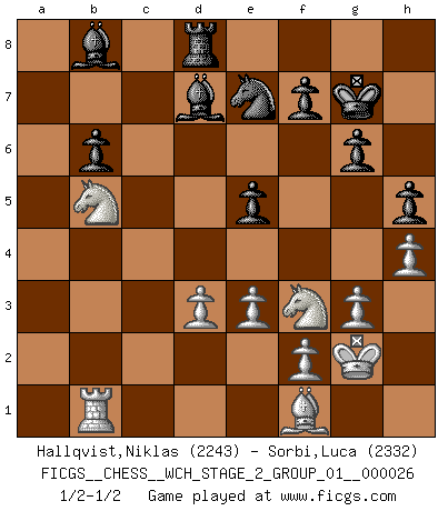 Last move : 1/2-1/2 2024 February 5 11:37:47 [Event "FICGS__CHESS__WCH_STAGE_2_GROUP_01__000026"] [Site "FICGS"] [Date "2023.10.03"] [Round "1"] [White "Hallqvist,Niklas"] [Black "Sorbi,Luca"] [Result "1/2-1/2"] [WhiteElo "2243"] [BlackElo "2332"] 1.c4 e5 2.g3 Nf6 3.Bg2 Nc6 4.Nc3 Bc5 5.a3 d6 6.e3 Bb6 7.b4 O-O 8.d3 Ne7 9.Nf3 c6 10.O-O Bc7 11.Qc2 h6 12.Bb2 Be6 13.a4 Qd7 14.a5 Rac8 15.Rfc1 Ng6 16.Qe2 Rfe8 17.b5 cxb5 18.Nxb5 Bb8 19.Nc3 d5 20.cxd5 Nxd5 21.Ne4 b6 22.axb6 axb6 23.Rab1 Rxc1+ 24.Rxc1 Rd8 25.Ne1 Nge7 26.Bf1 Nc6 27.Ba3 Na7 28.Qb2 Nb5 29.Nf3 Nxa3 30.Qxa3 Qe7 31.Qxe7 Nxe7 32.Rb1 Bc7 33.Nc3 Bf5 34.Nb5 Bb8 35.Nc3 Bc7 36.Ne1 g6 37.h3 h5 38.h4 Kg7 39.Nb5 Bb8 40.Kg2 Bd7 41.Nf3 1/2-1/2 Follow this game move after move (download)The sign of a great Master is his ability to win a won game quickly and painlessly. (Irving Chernev) Eine Person mit durchschnittlichem IQ kann etwa eine ELO von 2000 erreichen. (Jonathan Levitt) Un sacrificio se refuta mucho mejor al aceptarlo. (Wilhelm Steinitz) À la honte des hommes, on sait que les lois du jeu sont les seules qui soient partout justes, claires, inviolables et exécutées. Pourquoi l'Indien qui a donné les règles du jeu d'échecs est-il obéi de bon gré dans toute la terre, et que les décrétales des papes, par exemple, sont aujourd'hui un objet d'horreur et de mépris ? C'est que l'inventeur des échecs combina tout avec justesse pour la satisfaction des joueurs, et que les papes, dans leurs décrétales, n'eurent en vue que leur seul avantage. L'Indien voulut exercer également l'esprit des hommes et leur donner du plaisir; les papes ont voulu abrutir l'esprit des hommes. Voltaire (Dictionnaire philosophique / Garnier 1967) Somehow our devils are never quite what we expect when we meet them face to face. (Nelson DeMille)