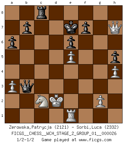 Last move : 1/2-1/2 2024 January 6 7:53:3 [Event "FICGS__CHESS__WCH_STAGE_2_GROUP_01__000026"] [Site "FICGS"] [Date "2023.10.03"] [Round "1"] [White "Zerowska,Patrycja"] [Black "Sorbi,Luca"] [Result "1/2-1/2"] [WhiteElo "2121"] [BlackElo "2332"] 1.e4 c5 2.Nc3 Nc6 3.Nge2 g6 4.d4 cxd4 5.Nxd4 Bg7 6.Be3 Nf6 7.Bc4 O-O 8.Bb3 d6 9.f3 Bd7 10.h4 h5 11.Qd2 Ne5 12.O-O-O Rc8 13.Bh6 Nc4 14.Bxc4 Rxc4 15.Bxg7 Kxg7 16.Kb1 Qa5 17.Qe3 Rfc8 18.Rd3 Qe5 19.a3 a6 20.Qd2 Qg3 21.f4 Qg4 22.e5 dxe5 23.fxe5 Ne4 24.Nxe4 Qxe4 25.Re1 Qg4 26.b3 R4c5 27.Rf3 Bf5 28.Rf4 Qg3 29.Rxf5 Rxc2 30.Nxc2 Qxb3+ 31.Kc1 gxf5 32.Qg5+ Kf8 33.Qxf5 e6 34.Qh7 Ke7 35.Kd1 Qd5+ 36.Kc1 Qb3 37.Kd2 1/2-1/2 Follow this game move after move (download)As one by one I mowed them down, my superiority soon became apparent. (Jose Capablanca) Frage des Reporters: -Welche besonderen Umstände rechtfertigen das Anhalten der Uhren während einer Turnierpartie? Antwort: -Einen Fotographen zu strangulieren. (Siegbert Tarrasch) Después de la respuesta de las negras a 1.e4 con 1..e5, se quedan siempre tratando de entrar dentro del juego. (Howard Staunton) Le succès, c'est être capable d'aller d'échec en échec sans perdre son enthousiasme. (Winston Churchill) Art is the triumph over chaos. (John Cheever)