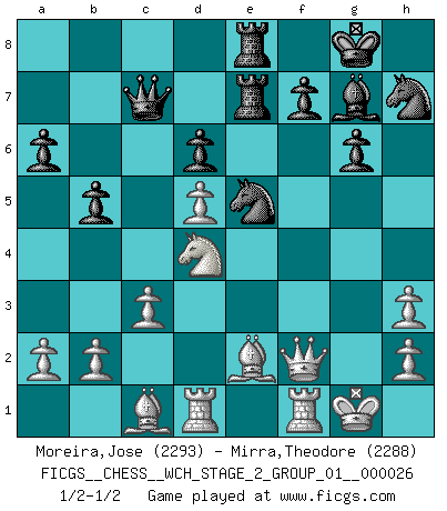 Last move : 1/2-1/2 2023 October 7 16:12:49 [Event "FICGS__CHESS__WCH_STAGE_2_GROUP_01__000026"] [Site "FICGS"] [Date "2023.10.03"] [Round "1"] [White "Moreira,Jose"] [Black "Mirra,Theodore"] [Result "1/2-1/2"] [WhiteElo "2293"] [BlackElo "2288"] 1.e4 c5 2.Nf3 d6 3.d4 cxd4 4.Nxd4 Nf6 5.Nc3 a6 6.f3 e5 7.Nb3 Be6 8.Be3 h5 9.Nd5 Bxd5 10.exd5 Nbd7 11.Qd2 g6 12.Be2 Bg7 13.O-O b6 14.Rad1 h4 15.Qb4 Qc7 16.f4 h3 17.fxe5 Nxe5 18.gxh3 O-O 19.c3 Rfe8 20.Bg5 Nh7 21.Bc1 b5 22.Qh4 Re7 23.Nd4 Rae8 24.Qf2 Nc4 25.Bg4 Ne5 26.Be2 Nc4 27.Bg4 Ne5 28.Be2 1/2-1/2 Follow this game move after move (download)In complicated positions, Bobby Fischer hardly had to be afraid of anybody. (Paul Keres) Schach ist das schnellste Spiel der Welt, weil man in jeder Sekunde Tausende von Gedanken ordnen muß. (Albert Einstein) El Ajedrez es tortura mental. (Garry Kasparov) Des combinaisons [dans le jeu d'échecs] pareilles à des mélodies. Je crois entendre pour ainsi dire la musique des coups... (Vladimir Nabokov) Gambling : The sure way of getting nothing from something. (Wilson Mizner)