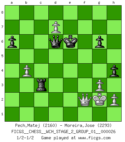 Last move : 1/2-1/2 2024 January 22 3:42:41 [Event "FICGS__CHESS__WCH_STAGE_2_GROUP_01__000026"] [Site "FICGS"] [Date "2023.10.03"] [Round "1"] [White "Pech,Matej"] [Black "Moreira,Jose"] [Result "1/2-1/2"] [WhiteElo "2160"] [BlackElo "2293"] 1.e4 c5 2.Nf3 d6 3.d4 cxd4 4.Nxd4 Nf6 5.Nc3 a6 6.Be3 e5 7.Nb3 Be6 8.f3 h5 9.Qd2 Nbd7 10.Nd5 Nxd5 11.exd5 Bf5 12.Na5 Be7 13.Be2 Bh4+ 14.g3 Bf6 15.O-O Qc7 16.c4 Bh3 17.Rf2 O-O 18.Rc1 e4 19.c5 exf3 20.cxd6 Qxd6 21.Nc4 Qc7 22.d6 Qd8 23.Bxf3 Rb8 24.b4 Re8 25.Bf4 Be6 26.Na5 Qb6 27.Be3 Qb5 28.Be2 Qe5 29.Bf4 Qd4 30.Bf1 Rec8 31.Rc7 Nb6 32.Rxc8+ Rxc8 33.Nxb7 Nd5 34.Nc5 Nxf4 35.Qxf4 Bxa2 36.Qd2 Be6 37.Nxe6 fxe6 38.Bh3 Rc6 39.Bxe6+ Kh7 40.Qe2 g6 41.d7 Kg7 42.Kg2 Rc3 43.Rf4 Qd6 44.Rf2 h4 45.Rxf6 Kxf6 46.Qf2+ Kxe6 1/2-1/2 Follow this game move after move (download)I look one move ahead... the best ! (Siegbert Tarrasch) Lisa Lane, amerikanische Schachmeisterin, hatte Fischer einmal als stärksten lebenden Spieler bezeichnet. Antwort: Das ist richtig, aber Lisa Lane ist eigentlich nicht in der Lage, das zu beurteilen. (Robert James Fischer) Te sientas frente a un tablero y repentinamente tu corazón brinca. Tu mano tiembla al tomar una pieza y moverla. Pero lo que el Ajedrez te enseña es que tu debes permanecer ahí con calma y pensar de que si realmente es una buena idea o de que si hay otras ideas mejores. (Stanley Kubrick) Aidez vos pièces, elles vous aideront. (Paul Morphy) Programmer - an organism that turns coffee into software. (Anonymous)