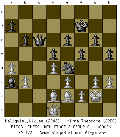 Last move : 1/2-1/2 2023 November 29 10:12:39 [Event "FICGS__CHESS__WCH_STAGE_2_GROUP_01__000026"] [Site "FICGS"] [Date "2023.10.03"] [Round "1"] [White "Hallqvist,Niklas"] [Black "Mirra,Theodore"] [Result "1/2-1/2"] [WhiteElo "2243"] [BlackElo "2288"] 1.d4 Nf6 2.c4 e6 3.g3 d5 4.Bg2 Bb4+ 5.Bd2 Be7 6.Qc2 O-O 7.Nf3 c6 8.O-O b6 9.Bf4 Bb7 10.Rd1 Nbd7 11.Ne5 Nh5 12.Bd2 Nhf6 13.cxd5 cxd5 14.Nc6 Bxc6 15.Qxc6 Rc8 16.Qb5 Ne8 17.Qb3 Nd6 18.Nc3 Nf6 19.Nb5 Qd7 20.Nxd6 Bxd6 21.Rac1 h6 22.a3 Rfd8 23.Qd3 Qb7 24.Qb3 Ne4 25.Be1 Rxc1 26.Rxc1 Rc8 27.Rc2 f5 28.Bf3 Kf7 29.h3 Rxc2 30.Qxc2 Qc7 31.Qd1 g6 32.Kg2 Qc4 33.b3 Qc6 34.a4 Nf6 35.e3 h5 36.Bd2 Ba3 37.Be2 Ne4 1/2-1/2 Follow this game move after move (download)There must have been a time when men were demigods, or they could not have invented Chess. (Gustav Schenk) Habe Mut, dich deines eigenen Verstandes zu bedienen. (Immanuel Kant) Antes de los Finales, los dioses han colocado el Juego Medio. (Siegbert Tarrasch) Vous m'avez demandé de vous exposer quel est le fondement de la prière. Je ne fais que préparer les pièces du jeu sur la table... Nous sera-t-il permis d'en adopter les règles et si nous les appliquons scrupuleusement nous ne tarderons pas à faire mat le Roi divin ! Il ne pourra échapper à nos mains. (Sainte Thérèse d'Avila, Chemin de perfection) I would love to change the world, but they won't give me the source code. (Unknown)