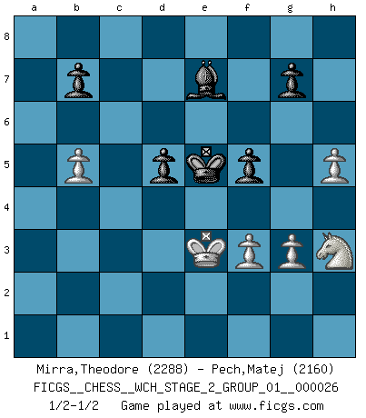 Last move : 1/2-1/2 2024 July 2 21:39:53 [Event "FICGS__CHESS__WCH_STAGE_2_GROUP_01__000026"] [Site "FICGS"] [Date "2023.10.03"] [Round "1"] [White "Mirra,Theodore"] [Black "Pech,Matej"] [Result "1/2-1/2"] [WhiteElo "2288"] [BlackElo "2160"] 1.e4 c5 2.Nf3 Nc6 3.Bb5 d6 4.O-O Bd7 5.Re1 Nf6 6.c3 a6 7.Bf1 Bg4 8.d4 cxd4 9.cxd4 d5 10.e5 Ng8 11.Re3 e6 12.h3 Bh5 13.Na3 Nge7 14.Rb3 Na5 15.Rc3 Nec6 16.Nc2 Rc8 17.Be2 Qb6 18.Kh2 Be7 19.Nfe1 Bg6 20.Bd3 O-O 21.Bxg6 hxg6 22.Rd3 Rc7 23.Rb1 Rfc8 24.Bf4 Nb4 25.Nxb4 Bxb4 26.Nf3 Qc6 27.a3 Be7 28.Ne1 g5 29.Bc1 f6 30.Rg3 Qe8 31.Nd3 Nc6 32.exf6 Bxf6 33.Bxg5 Bxd4 34.Bd2 Qf8 35.Qg4 Qf5 36.Qxf5 exf5 37.Kg1 Kf7 38.Bg5 Re8 39.Kf1 Ne5 40.Bf4 Rc2 41.Bxe5 Bxe5 42.Re3 Bd6 43.Rxe8 Kxe8 44.Ne1 Rc5 45.Rd1 Kd7 46.h4 Be7 47.g3 Kd6 48.Nd3 Rc2 49.Ke1 a5 50.Nf4 Rc5 51.b4 axb4 52.axb4 Rb5 53.Nd3 Bf6 54.Kd2 Bd4 55.h5 Rb6 56.Ke2 Rc6 57.Nf4 Rc4 58.b5 Rc2+ 59.Kf1 Ke5 60.Re1+ Kd6 61.Re6+ Kd7 62.Re2 Rxe2 63.Kxe2 Kd6 64.Nd3 Ke6 65.Nf4+ Kd6 66.Nd3 Kc7 67.Nb4 Kd6 68.Nc2 Bb6 69.Ne3 Ke5 70.Ng2 Bd8 71.Kd3 Kd6 72.Ne3 Ke5 73.Ng2 Bb6 74.Ke2 Bd8 75.Nf4 Bg5 76.Nh3 Bf6 77.Ke3 Bd8 78.Kd3 Bb6 79.Ke2 Bd8 80.f3 Be7 81.Ke3 Bc5+ 82.Ke2 Bd6 83.Nf4 Bc7 84.Kd3 Bb6 85.Nh3 Bc5 86.Ng5 Kf6 87.Nh3 Ke5 88.Kd2 Bb4+ 89.Ke3 Ba3 90.Kd2 Be7 91.Ke3 Bd8 92.Kd3 Be7 93.Ke3 1/2-1/2 Follow this game move after move (download)In complicated positions, Bobby Fischer hardly had to be afraid of anybody. (Paul Keres) Wenn du auf das Glück wartest, wird das Leben ziemlich langweilig. (Mikhail Nekhemyevich Tal) Para mi, el Ajedrez es la vida y cada partida es como una nueva vida. Todo jugador de Ajedrez suele vivir muchas vidas durante su vida. (Eduard Gufeld) Aux échecs, les retours au sommet sont rares : les dommages psychologiques consécutifs à une défaite sont trop sévères. (Daily Telegraph) Every man's memory is his private literature. (Aldous Huxley)