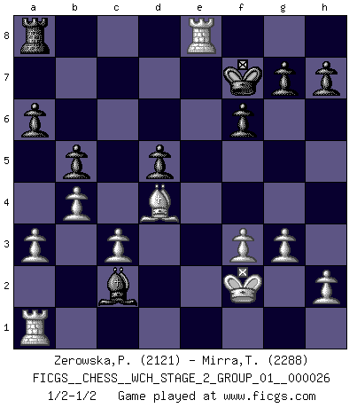 Last move : 1/2-1/2 2023 November 16 11:16:19 [Event "FICGS__CHESS__WCH_STAGE_2_GROUP_01__000026"] [Site "FICGS"] [Date "2023.10.03"] [Round "1"] [White "Zerowska,Patrycja"] [Black "Mirra,Theodore"] [Result "1/2-1/2"] [WhiteElo "2121"] [BlackElo "2288"] 1.e4 e5 2.Nf3 Nc6 3.Bb5 a6 4.Ba4 Nf6 5.O-O Be7 6.Re1 b5 7.Bb3 O-O 8.c3 d5 9.exd5 Nxd5 10.Nxe5 Nxe5 11.Rxe5 c6 12.d3 Bd6 13.Re1 Bf5 14.Qf3 Qh4 15.g3 Qh3 16.Be3 Bxd3 17.Bxd5 cxd5 18.Nd2 Qf5 19.Qxf5 Bxf5 20.a3 Rfe8 21.Nb3 f6 22.Nd4 Bg6 23.f3 Bc5 24.b4 Bxd4 25.Bxd4 Bc2 26.Kf2 Kf7 27.Rxe8 1/2-1/2 Follow this game move after move (download)Play the opening like a book, the middle game like a magician, and the endgame like a machine. (Spielmann) Karpov ist ein Museumsstück. (Garry Kasparov) Yo he agregado estos principios a la ley: pongan los Caballos en acción antes de que los dos Alfiles sean desarrollados. (Emanuel Lasker) RxDa4 pat (...) There are two types of people in this world, good and bad. The good sleep better, but the bad seem to enjoy the waking hours much more. (Woody Allen)