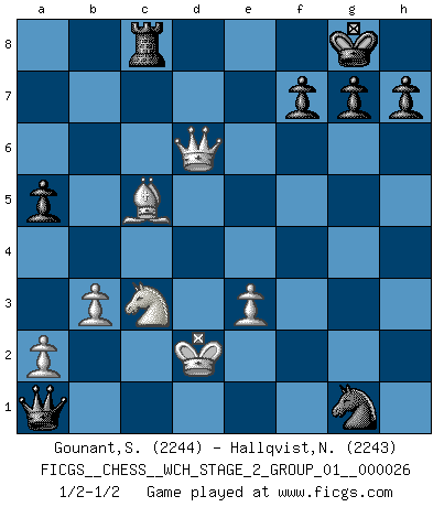 Last move : 1/2-1/2 2023 November 12 15:41:50 [Event "FICGS__CHESS__WCH_STAGE_2_GROUP_01__000026"] [Site "FICGS"] [Date "2023.10.03"] [Round "1"] [White "Gounant,Stanislas"] [Black "Hallqvist,Niklas"] [Result "1/2-1/2"] [WhiteElo "2244"] [BlackElo "2243"] 1.b3 c5 2.Bb2 Nf6 3.Nf3 Nc6 4.c4 e6 5.e3 d5 6.cxd5 exd5 7.Bb5 Bd6 8.O-O O-O 9.d4 cxd4 10.Nxd4 Bc7 11.Nf3 a6 12.Bxc6 bxc6 13.Qc2 Bd7 14.Be5 Rc8 15.Qd3 a5 16.h3 Bb6 17.Nc3 Re8 18.Na4 Ba7 19.Qa6 Ra8 20.Qb7 Ne4 21.Bc7 Qf6 22.Bb6 Bxh3 23.Bxa7 Nd6 24.Qxc6 Bxg2 25.Kxg2 Qg6+ 26.Kh1 Qe4 27.Rg1 Nf5 28.Rg2 Qxf3 29.Kg1 Rac8 30.Qb5 Re6 31.Nc3 Nh4 32.Rg3 Rg6 33.Qxd5 Rxg3+ 34.fxg3 Qxg3+ 35.Kf1 Nf3 36.Bc5 Qg1+ 37.Ke2 Qxa1 38.Qd7 Rb8 39.Qd6 Ng1+ 40.Kd2 Rc8 1/2-1/2 Follow this game move after move (download)Examine moves that smite! A good eye for smites is far more important than a knowledge of strategical principles. (Purdy) Aljechin war kein Nazi. Er war ein Opportunist. Ein schrecklicher Mann. Er liebte Geld über alles und würde für Geld ein Jude, ein Katolik oder ein Protestant werden. (Miguel Najdorf) El Ajedrez es 99 por ciento táctica. (Teichmann) Toutes les manuvres exécutées sur une colonne ouverte ont pour but ultime l'intrusion définitive sur la septième ou la huitième rangée, en plein cur de la position ennemie. (Aaron Nimzovitch) The real voyage of discovery consists not in seeking new lands but in seeing with new eyes. (Marcel Proust)