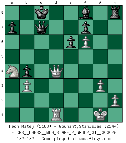 Last move : 1/2-1/2 2023 December 8 6:11:51 [Event "FICGS__CHESS__WCH_STAGE_2_GROUP_01__000026"] [Site "FICGS"] [Date "2023.10.03"] [Round "1"] [White "Pech,Matej"] [Black "Gounant,Stanislas"] [Result "1/2-1/2"] [WhiteElo "2160"] [BlackElo "2244"] 1.d4 d5 2.c4 c6 3.Nf3 Nf6 4.Nc3 e6 5.Bg5 dxc4 6.e4 b5 7.e5 h6 8.Bh4 g5 9.Nxg5 hxg5 10.Bxg5 Nbd7 11.g3 Bb7 12.Bg2 Qb6 13.exf6 O-O-O 14.O-O c5 15.d5 b4 16.Na4 Qb5 17.a3 Nb8 18.axb4 cxb4 19.Qg4 Bxd5 20.Rfc1 Nc6 21.Bxd5 Rxd5 22.Rxc4 Rxg5 23.Qd4 Kb8 24.Rxc6 Rxg3+ 25.fxg3 Qxc6 26.Rd1 Qc7 27.b3 Kc8 28.Qe4 Kb8 29.Qd4 Kc8 1/2-1/2 Follow this game move after move (download)I'm not afraid of Spassky. The world knows I'm the best. You don't need a match to prove it. (Bobby Fischer) Ich hatte Angst gegen einen russischen Großmeister zu verlieren, und er befürchtete gegen einen kleinen Jungen zu verlieren. (über ein Remis gegen Juri Awerbach). (Robert James Fischer) Debió haber existido una vez en que los hombres eran semidióses, de otra manera no hubiesen podido inventar el Ajedrez. (Gustav Schenk) La vie et les Echecs sont tous les deux une lutte constante. (Lasker) Information on the Internet is subject to the same rules and regulations as conversation at a bar. (George Lundberg)