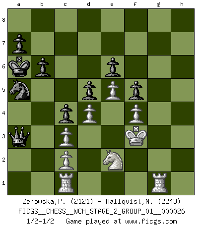 Last move : 1/2-1/2 2024 January 26 22:11:16 [Event "FICGS__CHESS__WCH_STAGE_2_GROUP_01__000026"] [Site "FICGS"] [Date "2023.10.03"] [Round "1"] [White "Zerowska,Patrycja"] [Black "Hallqvist,Niklas"] [Result "1/2-1/2"] [WhiteElo "2121"] [BlackElo "2243"] 1.e4 e6 2.d4 d5 3.Nc3 Bb4 4.e5 c5 5.a3 Bxc3+ 6.bxc3 Ne7 7.h4 Qa5 8.Bd2 Nbc6 9.h5 Qc7 10.Qg4 Rg8 11.Nf3 Bd7 12.Bd3 f5 13.Qf4 h6 14.Rh3 O-O-O 15.Kf1 c4 16.Be2 Rge8 17.a4 Rh8 18.Ng1 Rdg8 19.Bc1 Nd8 20.Ba3 Be8 21.Qc1 Nf7 22.f4 g5 23.hxg6 Rxg6 24.Bh5 Rg7 25.Kf2 Rhg8 26.g3 Nc6 27.Ne2 Qd7 28.Qh1 Nfd8 29.Bf3 h5 30.Bxh5 Bxh5 31.Rxh5 b6 32.Rb1 Na5 33.Ra1 Nac6 34.Ke3 Kb7 35.Rb1 Na5 36.Bb4 Qxa4 37.Bxa5 Qxa5 38.Rh8 Rxg3+ 39.Kf2 Rg2+ 40.Qxg2 Rxg2+ 41.Kxg2 Qa2 42.Rc1 Nc6 43.Kf2 Na5 44.Rh7+ Ka6 45.R7h1 Kb5 46.Kf3 Ka6 47.Rhg1 Qa3 48.Rce1 Qb2 49.Rc1 Qa3 1/2-1/2 Follow this game move after move (download)He who takes the Queen's Knight's Pawn will sleep in the streets. (Anonymous) Das ganze Leben mit einer Ehefrau ist wie ein Endspiel mit ungleichfarbigen Läufern. (Viktor Kortschnoi) Todos los Maestros de Ajedrez fueron un día unos principiantes. (Chernev) Psychologiquement, tu dois avoir confiance en toi même, mais cette confiance doit être basée sur des faits. (Robert Fischer) Perhaps the current trend of many chess professionals taking up the more lucrative pastime of poker is not a wholly negative one. It may not be too late for humans to relearn how to take risks in order to innovate and thereby maintain the advanced lifestyles we enjoy. And if it takes a poker-playing supercomputer to remind us that we can't enjoy the rewards without taking the risks, so be it. (The Chess Master and the Computer, by Garry Kasparov - 2010)