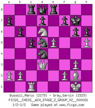 Last move : 1/2-1/2 2023 November 22 11:21:24 [Event "FICGS__CHESS__WCH_STAGE_2_GROUP_02__000026"] [Site "FICGS"] [Date "2023.10.03"] [Round "1"] [White "Bussoli,Marco"] [Black "Gray,Garvin"] [Result "1/2-1/2"] [WhiteElo "2279"] [BlackElo "2329"] 1.d4 Nf6 2.c4 e6 3.Nf3 b6 4.g3 Ba6 5.Qc2 c5 6.d5 exd5 7.cxd5 Bb7 8.Bg2 Nxd5 9.O-O Be7 10.Rd1 Nc6 11.Qf5 Nf6 12.e4 g6 13.Qf4 O-O 14.e5 Nh5 15.Qc4 Na5 16.Qd3 Ng7 17.Nc3 Ne6 18.Bh6 Re8 19.Rac1 Bxf3 20.Qxf3 Nc6 21.h4 Rc8 22.Rd5 Bf8 23.Bxf8 Kxf8 24.Ne4 Ned4 25.Qe3 Kg7 26.Nd6 Ne7 27.h5 h6 28.Qd3 Nxd5 1/2-1/2 Follow this game move after move (download)A great player and a great example for many. His book My 60 Memorable Games had a big impact on me. It is a shame he didn't continue to enrich the world of chess with his unparalleled understanding after 1972. (Jan Timman, about Bobby Fischer's death) Das Zentrum ist der Balkan des Schachbretts - Kriegshandlungen können in jedem Moment ausbrechen. (Aaron Nimzowitsch) La vida es como el Ajedrez, con lucha, competición y eventos buenos y malos. (Benjamin Franklin) Les échecs, c'est l'imagination. (David Bronstein) Treat your password like your toothbrush. Don't let anybody else use it, and get a new one every six months. (Clifford Stoll)