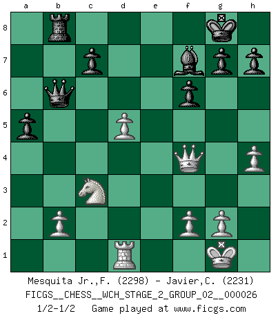 Last move : 1/2-1/2 2024 January 15 9:55:6 [Event "FICGS__CHESS__WCH_STAGE_2_GROUP_02__000026"] [Site "FICGS"] [Date "2023.10.03"] [Round "1"] [White "Mesquita Jr.,Fausto Monteiro"] [Black "Javier,Christian"] [Result "1/2-1/2"] [WhiteElo "2298"] [BlackElo "2231"] 1.e4 e5 2.Nf3 Nc6 3.Bb5 Nf6 4.O-O Nxe4 5.d4 Nd6 6.dxe5 Nxb5 7.a4 Nbd4 8.Nxd4 d5 9.exd6 Nxd4 10.Qxd4 Qxd6 11.Qe3+ Be6 12.Nc3 a6 13.Rd1 Qc6 14.Rd3 Bc5 15.Qg3 f6 16.Be3 Bd6 17.Bf4 Bxf4 18.Qxf4 Rd8 19.h4 O-O 20.a5 Bf7 21.Qa4 Qe6 22.Qb4 Qc6 23.Rad1 Rxd3 24.cxd3 Re8 25.d4 b6 26.axb6 Rb8 27.d5 Qxb6 28.Qf4 a5 1/2-1/2 Follow this game move after move (download)What is the difference between chess and football? Everybody understands football, but nobody plays it. Everybody plays chess, but nobody understands it. Everything is relative. (Vladimir Kramnik) Wenn Capablanka heute auf der Schachbühne erscheinen würde, hätte er ein halbes Jahr gebraucht um sich die Schachtheorie anzueignen. Und dann hätte er alles und jeden besiegt. (Mikhail Moiseyevich Botvinik) Hay dos clases de hombres: aquellos que se conforman en dejarse llevar por las circunstancias y que juegan barajas y aquellos decididos a controlar las circunstancias y que juegan al Ajedrez. (Mortimer Collins) Aucun coup ne doit être joué sans but. (Pedro Damiano) It is a good thing for an uneducated man to read books of quotations. (Winston Churchill)