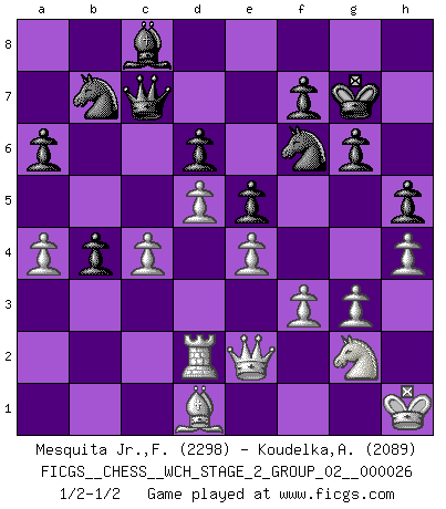 Last move : 1/2-1/2 2024 March 15 22:27:3 [Event "FICGS__CHESS__WCH_STAGE_2_GROUP_02__000026"] [Site "FICGS"] [Date "2023.10.03"] [Round "1"] [White "Mesquita Jr.,Fausto Monteiro"] [Black "Koudelka,Artur"] [Result "1/2-1/2"] [WhiteElo "2298"] [BlackElo "2089"] 1.e4 e5 2.Nf3 Nc6 3.Bb5 a6 4.Ba4 Nf6 5.O-O Be7 6.Re1 b5 7.Bb3 d6 8.c3 O-O 9.h3 Na5 10.Bc2 c5 11.d4 Qc7 12.d5 Nc4 13.b3 Nb6 14.Be3 Bd7 15.a4 bxa4 16.bxa4 Nc4 17.Bg5 h6 18.Bc1 Na5 19.Nbd2 Rab8 20.Qe2 Rfc8 21.Ba3 Rb6 22.Reb1 Rcb8 23.Rxb6 Rxb6 24.c4 Rb7 25.Ra2 Qb8 26.Qe3 Nh5 27.h4 g6 28.g3 Bf8 29.Qc3 Qd8 30.Ne1 Bg7 31.Qf3 Qb8 32.Bc1 Rb4 33.Nd3 Rb7 34.Qe2 Qd8 35.Bb2 Nf6 36.Bc3 h5 37.Ne1 Bh6 38.Qd3 Bg4 39.f3 Bd7 40.Ng2 Bc8 41.Bd1 Qc7 42.Ne3 Rb4 43.Kh1 Kg7 44.Qe2 Nb7 45.Bxb4 cxb4 46.Ng2 Bxd2 47.Rxd2 1/2-1/2 Follow this game move after move (download)Every Chess master was once a beginner. (Chernev) Kostenjuk hat keinen Sexappeal. (Loek van Wely) El Ajedrez es realmente noventa y nueve por ciento calculación. (Soltis) La conception d'un plan est le processus par lequel un joueur exploite les avantages de sa position tout en s'efforçant d'en réduire au minimum les inconvénients. Afin de garantir le succès, un plan doit toujours se fonder sur un diagnostic objectif des particularités d'une position. La conception d'un plan est d'autant plus difficile que la position est équilibrée, et grandement facilitée lorsqu'il n'existe qu'un seul plan susceptible de répondre aux exigences de la position. (Harry Golombek) The question of whether computers can think is just like question of whether submarines can swim. (Edsger W. Dijkstra)
