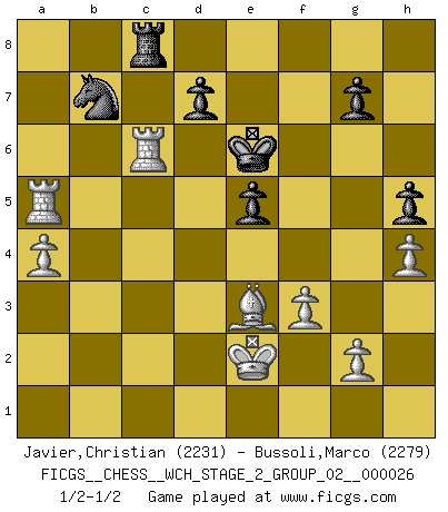 Last move : 1/2-1/2 2023 December 7 17:0:35 [Event "FICGS__CHESS__WCH_STAGE_2_GROUP_02__000026"] [Site "FICGS"] [Date "2023.10.03"] [Round "1"] [White "Javier,Christian"] [Black "Bussoli,Marco"] [Result "1/2-1/2"] [WhiteElo "2231"] [BlackElo "2279"] 1.d4 Nf6 2.c4 e6 3.Nc3 Bb4 4.Nf3 O-O 5.e3 b6 6.Bd3 Bb7 7.O-O c5 8.Re1 Bxc3 9.bxc3 Ne4 10.Nd2 f5 11.f3 Nxd2 12.Qxd2 Qg5 13.e4 Qxd2 14.Bxd2 fxe4 15.Bxe4 Bxe4 16.Rxe4 cxd4 17.cxd4 Na6 18.Rc1 Rfc8 19.Kf2 Kf7 20.h4 Rc6 21.Re3 Nc7 22.Rec3 Rc8 23.Ke2 h5 24.Ra3 a5 25.c5 Na6 26.R1c3 bxc5 27.dxc5 e5 28.Rxa5 Ke6 29.a4 Nxc5 30.Be3 Nb7 31.Rxc6+ 1/2-1/2 Follow this game move after move (download)Chess is a terrible game. If you have no center, your opponent has a freer position. If you do have a center, then you really have something to worry about ! (Siegbert Tarrasch) Wie ich sie so einen nach dem anderen nieder mähte wurde meine Überlegenheit offensichtlich. (José Raúl Capablanca) El Ajedrez es la vida. (Bobby Fischer) Des points faibles ou des trous dans la position de l'adversaire doivent être occupés par des pièces et non pas par des pions. (Siegbert Tarrasch) They say in chess you've got to kill the queen, and then you mate it... Oh I, do you ? (Red Hot Chili Peppers, Fortune faded)