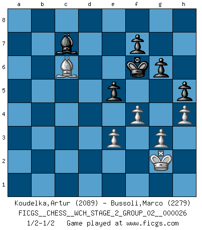 Last move : 1/2-1/2 2024 January 9 18:38:11 [Event "FICGS__CHESS__WCH_STAGE_2_GROUP_02__000026"] [Site "FICGS"] [Date "2023.10.03"] [Round "1"] [White "Koudelka,Artur"] [Black "Bussoli,Marco"] [Result "1/2-1/2"] [WhiteElo "2089"] [BlackElo "2279"] 1.c4 e5 2.Nc3 Nf6 3.Nf3 Nc6 4.g3 d5 5.cxd5 Nxd5 6.Bg2 Bc5 7.O-O O-O 8.d3 h6 9.Nxd5 Qxd5 10.a3 a5 11.Bd2 Rd8 12.Bc3 Qe6 13.Qc2 Qe7 14.Rac1 Bb6 15.Nd2 Be6 16.Nc4 Bd5 17.b4 Bxc4 18.dxc4 axb4 19.axb4 Nxb4 20.Bxb4 Qxb4 21.Qe4 Qc5 22.Qxb7 Ra2 23.e3 g6 24.Bd5 h5 25.Ra1 Rd2 26.Ra8 Qd6 27.Rxd8+ Qxd8 28.Qc6 Kg7 29.h4 Qf6 30.Qxf6+ Kxf6 31.Ra1 Rc2 32.Ra8 Kg7 33.Re8 c6 34.Bxc6 Rxc4 35.Bf3 Kf6 36.Rb8 Ba5 37.Rb5 Rc1+ 38.Kg2 Bd8 39.Rd5 Be7 40.Rd7 Ke6 41.Rb7 Bd6 42.Ra7 Rc2 43.Ra6 Rc3 44.Ra7 Rc7 45.Rxc7 Bxc7 46.Bc6 Kf6 47.f4 1/2-1/2 Follow this game move after move (download)One bad move nullifies forty good ones. (Horowitz) Sitze auf Deine Hände. (Siegbert Tarrasch) Cada Peón es una Reina en potencia. (James Mason) Karpov est une pièce de musée. (Garry Kasparov) Bobby never cared about money, though. His only desire was to prove that his choices were correct: He wanted chess to be important because he was a chess player, and he wanted to be important. Bobby knew money was important, but he didn't have a clue why, outside of clothes and status. The only way he could accomplish what he wanted was to fight for a lot of money. Once he got it, he gave it away. He did not know how to spend it. And once he'd become champion, after, essentially, sacrificing his life for it, he didn't know how to spend his time. (Bob Wade)