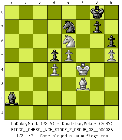 Last move : 1/2-1/2 2024 January 21 14:50:9 [Event "FICGS__CHESS__WCH_STAGE_2_GROUP_02__000026"] [Site "FICGS"] [Date "2023.10.03"] [Round "1"] [White "LaDuke,Matt"] [Black "Koudelka,Artur"] [Result "1/2-1/2"] [WhiteElo "2249"] [BlackElo "2089"] 1.e4 e6 2.d4 d5 3.Nc3 Nf6 4.e5 Nfd7 5.f4 c5 6.Nf3 Nc6 7.Be3 a6 8.Ne2 Be7 9.c3 O-O 10.h4 f6 11.Qc2 b5 12.g3 b4 13.Bh3 Kh8 14.O-O bxc3 15.Qxc3 c4 16.Rab1 a5 17.Bd2 f5 18.g4 Nb6 19.Rf2 Nb4 20.Rg2 Rb8 21.Kh2 fxg4 22.Bxg4 Nd3 23.Qc2 a4 24.h5 Qe8 25.b3 Bd7 26.Nfg1 Nc8 27.Nh3 axb3 28.axb3 Bh4 29.R2g1 Rxb3 30.Rxb3 Ba4 31.Qc3 Bxb3 32.f5 exf5 33.Bf3 f4 34.Nexf4 Nxf4 35.Nxf4 Ne7 36.Rg2 h6 37.Bg4 Qf7 38.Ne6 Ra8 39.Qh3 Bf2 40.Qf3 Qxf3 41.Bxf3 c3 42.Rxf2 cxd2 43.Rxd2 Ra2 44.Rxa2 Bxa2 45.Kg3 Kg8 46.Kf4 1/2-1/2 Follow this game move after move (download)A Chess game is a dialogue, a conversation between a player and his opponent. Each move by the opponent may contain threats or be a blunder, but a player cannot defend against threats or take advantage of blunders if he does not first ask himself: What is my opponent planning after each move ? (Bruce A. Moon) Wenn Spassky eine Figur opfert kannst du genauso gut aufgeben. Aber wenn Tal eine Figur opfert, spiel weiter. Er könnte noch eine weitere opfern, und dann ... wer weiß? (Miguel Najdorf) Yo siempre he tenido un ligero sentimiento de lástima por una persona que no tiene conocimiento del Ajedrez. (Siegbert Tarrasch) Les Cavaliers se révèlent fort utiles dans les positions fermées. D'habitude, les Fous sont un peu plus forts que les Cavaliers dans les positions ouvertes. Qu'on le veuille ou non, il restera toujours des exceptions ! Luck is when opportunity knocks and you answer. (Anonymous)