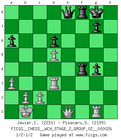Last move : 1/2-1/2 2024 January 17 6:30:5 [Event "FICGS__CHESS__WCH_STAGE_2_GROUP_02__000026"] [Site "FICGS"] [Date "2023.10.03"] [Round "1"] [White "Javier,Christian"] [Black "Ploscaru,Stelian"] [Result "1/2-1/2"] [WhiteElo "2231"] [BlackElo "2199"] 1.e4 c5 2.Nf3 d6 3.Nc3 Nf6 4.d4 cxd4 5.Nxd4 a6 6.Be3 e5 7.Nb3 Be6 8.h3 Nbd7 9.g4 h6 10.Qd2 b5 11.Bg2 Nb6 12.Na5 Rc8 13.Nd5 Nc4 14.Nxc4 bxc4 15.Qc3 Nxd5 16.exd5 Bd7 17.f4 Be7 18.O-O-O Bf6 19.fxe5 Bxe5 20.Bd4 Bxd4 21.Rxd4 O-O 22.Kb1 Qg5 23.Qg3 Qg6 24.Rhd1 f5 25.Bf1 fxg4 26.hxg4 h5 27.Bxc4 Bb5 28.Bd3 Bxd3 29.R4xd3 hxg4 30.Rg1 Rc4 31.a3 Rcf4 32.Qe1 Qe8 1/2-1/2 Follow this game move after move (download)Pawn endings are to Chess what putting is to golf. (Cecil Purdy) Sicherlich können nur Meister einen Stil haben. Daß ein nicht-Meister auch nur ein einziges Mal in seinem Leben eine Partie folgerecht durchführte, habe ich niemals bemerkt. (Emanuel Lasker) De todos mis libros Rusos, la defensa contiene y difunde el 'calor' mas grande que pudiese verse extraño al observar lo supremamente abstracto que el Ajedrez supuestamente es. (Vladimir Nabokov) Il (Jacob Murray) ne joue pas pour le bon coup, mais pour le meilleur. (Eloi Relange) Kids, you tried your best and you failed miserably. The lesson is, never try. (Simpsons)