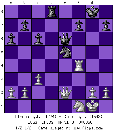 Last move : 1/2-1/2 2007 December 17 7:43:24 [Event "FICGS__CHESS__RAPID_B__000066"] [Site "FICGS"] [Date "2007.09.10"] [Round "1"] [White "Livenais,Jean-Rene"] [Black "Cirulis,Ilmars"] [Result "1/2-1/2"] [WhiteElo "1724"] [BlackElo "1543"] 1.e4 e5 2.Nf3 Nc6 3.d4 exd4 4.Nxd4 Bc5 5.Be3 Qf6 6.c3 Nge7 7.Bc4 d6 8.O-O O-O 9.Bb5 Bd7 10.Nd2 a6 11.Bxc6 Nxc6 12.Nc2 Rfe8 13.Bxc5 dxc5 14.Ne3 Rad8 15.f4 Ne7 16.Qh5 Bc6 17.Rad1 Qg6 18.Qxc5 Bxe4 19.f5 Qc6 20.Nxe4 Qxe4 21.Rxd8 Rxd8 22.f6 gxf6 23.Rxf6 Ng6 24.Nf1 c6 25.Qf2 Ne5 26.Rf4 Qg6 27.Qe2 Qe6 1/2-1/2 Scotch game Kingside Castling by player White (move 8) Kingside Castling by player Black (move 8) This chess game ended in a draw. Follow this game move after move (download)There just isn't enough televised Chess. (David Letterman) Im Wettkampf zwischen starken Meistern kommen Fehler sehr selten vor, deshalb ist es mit bloßem Warten nicht getan. (José Raúl Capablanca) No es suficiente ser un buen jugador, se debe también de jugar bién. (Siegbert Tarrasch) Les écrivains ont utilisé les échecs pour analyser les côtés extrêmes de la nature humaine. Dans ce cadre, les échecs offrent un champ d'expérimentation idéal. Mais on pourrait faire la même chose avec la peinture. Et là, en vous référant à Van Gogh, vous ne tirerez pas de conclusion définitive sur les peintres. (Gary Kasparov) Shallow men believe in luck. Strong men belive in cause and effect. (Ralph Waldo Emerson)