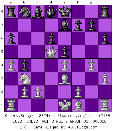 Last move : 1-0 2023 November 14 12:52:7 [Event "FICGS__CHESS__WCH_STAGE_2_GROUP_03__000026"] [Site "FICGS"] [Date "2023.10.03"] [Round "1"] [White "Kireev,Sergey"] [Black "Slawomir,Weglicki"] [Result "1-0"] [WhiteElo "2324"] [BlackElo "2199"] 1.e4 c5 2.Nf3 d6 3.d4 cxd4 4.Nxd4 Nf6 5.Nc3 a6 6.h3 e5 7.Nb3 Be7 8.g4 h6 9.Be3 b5 10.a4 b4 11.Nd5 Nxd5 12.Qxd5 1-0 This chess game has been lost on time (started : 2023.10.03 4:47:31) Follow this game move after move (download)The isolated Pawn casts gloom over the entire chessboard. (Aaron Nimzovich) Ich kämpfe solange mein Gegner einen Fehler machen kann. (Emanuel Lasker) Solo existe una cosa que Fischer hace en el Ajedrez sin placer: ¡perder!. (Boris Spassky) C'est une question de caractère, Beaucoup de gens perdent leur motivation très vite. D'autres, ils sont rares, peuvent la conserver très longtemps. J'aime les échecs, encore aujourd'hui je suis heureux d'analyser des parties. J'aime toujours gagner, je déteste encore perdre. Bien jouer est important pour mon intégrité intellectuelle et morale. Et puis les échecs vivent en ce moment une période historique grâce à Internet. Ils se développent dans les systèmes éducatifs à travers le monde. Ils sortent de leur ghetto, et c'est mon rôle de mener à bien cette révolution. (Gary Kasparov) Man with more than one clock never knows what time it is. (Chinese thought)