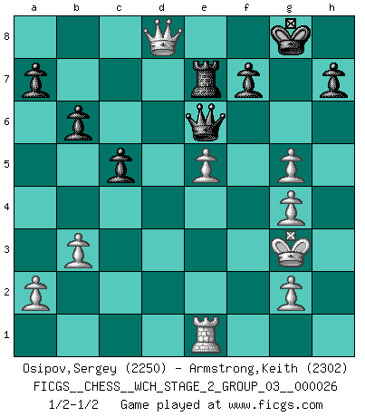 Last move : 1/2-1/2 2023 October 29 22:46:56 [Event "FICGS__CHESS__WCH_STAGE_2_GROUP_03__000026"] [Site "FICGS"] [Date "2023.10.03"] [Round "1"] [White "Osipov,Sergey"] [Black "Armstrong,Keith"] [Result "1/2-1/2"] [WhiteElo "2250"] [BlackElo "2302"] 1.d4 Nf6 2.c4 e6 3.Nf3 d5 4.Nc3 Bb4 5.Qa4+ Nc6 6.e3 O-O 7.Bd2 dxc4 8.Bxc4 Bd6 9.O-O e5 10.dxe5 Nxe5 11.Nxe5 Bxe5 12.Qc2 b6 13.f4 Bd6 14.Rae1 Bb7 15.h3 Re8 16.e4 Bb4 17.Bd3 Qd7 18.Rf2 Rad8 19.Bb5 Bc6 20.Bxc6 Qxc6 21.Kh2 Bxc3 22.e5 Ng4+ 23.hxg4 Qh6+ 24.Kg3 Bxd2 25.Rxd2 g5 26.fxg5 Rxd2 27.Qxd2 Qe6 28.b3 c5 29.Qd3 Re7 30.Qd8+ 1/2-1/2 Follow this game move after move (download)A player surprised is half beaten. (Proverb) Herr Iljumschinow ist ein etwas merkwürdiger Geschäftsmann: Er arbeitet zusammen mit Leuten wie Muammar al-Gaddafi; früher ist das Saddam Hussein gewesen. (Joel Lautier) Uno no tiene que jugar muy bien, es suficiente jugar mejor que el oponente. (Siegbert Tarrasch) Roi des jeux et jeu des rois, les échecs portent en eux un sentiment d'infini. Ils donnent à celui qui s'est efforcé d'en approfondir les arcanes l'impression de n'être pas à la mesure de l'homme; en fait, ils constituent un résumé de l'univers, un microcosme, et figurent cette grande échelle qui, dans les plans de la lumière descend jusqu'à la matière, qui des abîmes insondables remonte jusqu'en l'infini de Dieu. (Pyrame) Have no fear of perfection - you'll never reach it. (Salvador Dali)