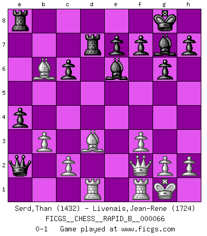 Last move : 0-1 2007 October 14 12:21:59 [Event "FICGS__CHESS__RAPID_B__000066"] [Site "FICGS"] [Date "2007.09.10"] [Round "1"] [White "Serd,Than"] [Black "Livenais,Jean-Rene"] [Result "0-1"] [WhiteElo "1432"] [BlackElo "1724"] 1.e4 c5 2.Nf3 g6 3.d4 cxd4 4.Nxd4 Nc6 5.Be3 Nf6 6.f3 Bg7 7.Nc3 O-O 8.Qd2 d5 9.exd5 Nxd5 10.Nxd5 Qxd5 11.Rd1 Qxa2 12.Nxc6 bxc6 13.b3 Be6 14.Bd3 Rfd8 15.O-O a5 16.Bb6 Rd7 17.Qf2 a4 0-1 Sicilian : Hungarian variation Kingside Castling by player Black (move 7) Kingside Castling by player White (move 15) Player Black won this chess game. Follow this game move after move (download)Nonsense was the last thing Fischer was interested in, as far as Chess was concerned. (Elie Agur) Strategie ist, wie man ein Mädchen auf den Rücksitz bekommt. Taktik ist, was man tut, wenn man dann dort ist. (Anonymous) Un buen jugador siempre tiene buena suerte. (José Raúl Capablanca) Les ravages du H expliquent la différence de niveau entre Tal et Thal [Abergel]. He is a liar. I just don't know what the lie is yet. (Horatio Caine, C.S.I. Miami)