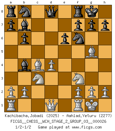 Last move : 1/2-1/2 2023 November 25 21:30:29 [Event "FICGS__CHESS__WCH_STAGE_2_GROUP_03__000026"] [Site "FICGS"] [Date "2023.10.03"] [Round "1"] [White "Kachibacha,Jobadi"] [Black "Aahlad,Yeturu"] [Result "1/2-1/2"] [WhiteElo "2025"] [BlackElo "2277"] 1.d4 Nf6 2.c4 e6 3.Nc3 Bb4 4.e3 O-O 5.Bd3 d5 6.Nf3 dxc4 7.Bxc4 c5 8.O-O cxd4 9.exd4 b6 10.Bg5 Bb7 1/2-1/2 Follow this game move after move (download)Half the variations which are calculated in a tournament game turn out to be completely superfluous. Unfortunately, no one knows in advance which half. (Jan Tinman) Deine Wertungszahl - vorausgesetzt einige Jahre schachliche Anstrengung - entspricht etwa dem zehnfachen Deines IQ plus 1000. (Jonathan Levitt) Siempre es mucho mejor sacrificar las piezas de tu oponente. (Savielly Tartakover) Il n'y a pas de prix trop élevé au scalp de l'ennemi. (Koblentz) All art requires courage. (Anne Tucker)