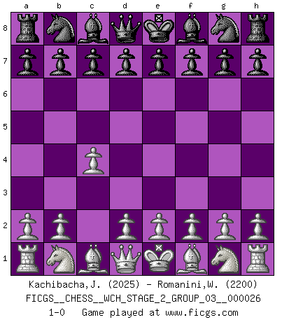 Last move : 1-0 2023 October 6 11:24:29 [Event "FICGS__CHESS__WCH_STAGE_2_GROUP_03__000026"] [Site "FICGS"] [Date "2023.10.03"] [Round "1"] [White "Kachibacha,Jobadi"] [Black "Romanini,William"] [Result "1-0"] [WhiteElo "2025"] [BlackElo "2200"] 1.c4 1-0 Follow this game move after move (download)Chess, like love, is infectious at any age. (Flohr) Kostenjuk hat keinen Sexappeal. (Loek van Wely) Bobby Fischer es el jugador de Ajedrez mas grande que jamás haya existido. (Ken Smith) On croit qu'il y a plus de mauvais joueurs que de bons joueurs, c'est faux : Il y a autant de joueurs qui gagnent que de joueurs qui perdent. (Philippe Geluck) When you've done things right people won't know you've done anything at all. (Futurama)