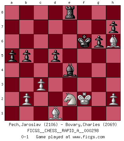 Last move : 0-1 2023 December 25 8:2:23 [Event "FICGS__CHESS__RAPID_A__000298"] [Site "FICGS"] [Date "2023.10.07"] [Round "1"] [White "Pech,Jaroslav"] [Black "Bovary,Charles"] [Result "0-1"] [WhiteElo "2106"] [BlackElo "2069"] 1.e4 e5 2.Nf3 Nc6 3.Bb5 a6 4.Ba4 Nf6 5.O-O Nxe4 6.d4 b5 7.Bb3 d5 8.dxe5 Be6 9.c3 Bc5 10.Nbd2 O-O 11.Bc2 Nxf2 12.Rxf2 f6 13.exf6 Bxf2+ 14.Kxf2 Qxf6 15.Nf1 Ne5 16.Be3 Rae8 17.Bc5 Nxf3 18.gxf3 Rf7 19.Ng3 Bg4 20.Kg1 Bxf3 21.Qd3 g6 22.Rf1 Qf4 23.Bd1 Be4 24.Qe2 Qg5 25.Rxf7 Kxf7 26.a4 c6 27.Be3 Qe7 28.Bf2 Qg5 29.Be3 Qe7 30.Bh6 Qc5+ 31.Qf2+ Qxf2+ 32.Kxf2 a5 33.axb5 cxb5 34.Ne2 Kf6 0-1 Follow this game move after move (download)I prefer to lose a really good game than to win a bad one. (David Levy) Es ist besser die Steine des Gegners zu opfern. (Savielly Grigorievitsch Tartakower) Me siento como si fuera una pieza en una partida de Ajedrez, cuando mi oponente me indica: esa pieza no puede ser movida. (Soren Kierkegaard) Si je n'étais pas joueur d'échecs, je serais le meilleur dans quelque chose d'autre. (Anatoli Karpov) Perseverance does not equal worthiness. Next time you want to get my attention, wear something fun. Low-riding jeans are hot. (Gregory House, House M.D.)