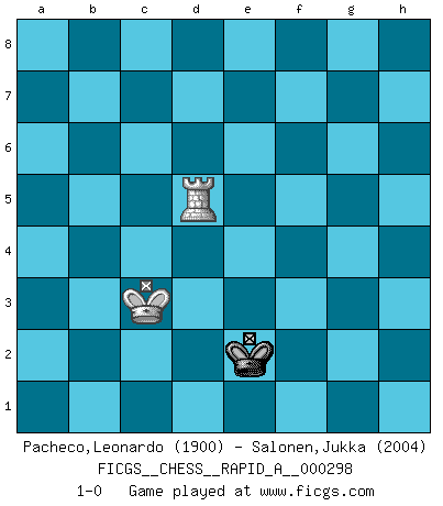 Last move : 1-0 2024 January 20 8:40:39 [Event "FICGS__CHESS__RAPID_A__000298"] [Site "FICGS"] [Date "2023.10.07"] [Round "1"] [White "Pacheco,Leonardo"] [Black "Salonen,Jukka"] [Result "1-0"] [WhiteElo "1900"] [BlackElo "2004"] 1.d4 d5 2.e4 dxe4 3.Nc3 Nf6 4.f3 exf3 5.Nxf3 Bg4 6.h3 Bh5 7.g4 Bg6 8.Ne5 e6 9.Bg2 c6 10.h4 Bb4 11.O-O Nbd7 12.Qe2 Nxe5 13.dxe5 Bc5+ 14.Kh2 Nd5 15.h5 Qh4+ 16.Bh3 f5 17.Nxd5 exd5 18.Rf4 fxg4 19.Qxg4 Qxg4 20.Rxg4 Bxh5 21.Rxg7 Bf7 22.e6 Bd6+ 23.Kg2 Bg6 24.Bg5 Bxc2 25.Kf3 h6 26.Bh4 b6 27.Ke2 Bf8 28.Rd7 Rh7 29.Bg4 h5 30.Rxh7 hxg4 31.Rh8 Be4 32.e7 Kf7 33.exf8Q+ Rxf8 34.Rxf8+ Kxf8 35.b4 Ke8 36.Rc1 Bf3+ 37.Ke3 Kd7 38.Bg3 Be4 39.Kd4 Bf3 40.a4 a6 41.a5 bxa5 42.bxa5 Be4 43.Kc5 Bd3 44.Kb6 Bb5 45.Rd1 Ke6 46.Rd4 Kf5 47.Bh4 Ke5 48.Rxg4 Ke6 49.Rg6+ Ke5 50.Rxc6 Bf1 51.Kb7 d4 52.Bf6+ Kd5 53.Bxd4 Kxd4 54.Rxa6 Kc5 55.Rb6 Bd3 56.a6 Bxa6+ 57.Kxa6 Kd4 58.Kb5 Kd5 59.Kb4 Kd4 60.Rb5 Kd3 61.Rd5+ Ke2 62.Kc3 1-0 Follow this game move after move (download)Bobby is the most misunderstood, misquoted celebrity walking the face of this earth. (Yasser Seirawan) Wenn es im Universum noch irgendwo intelligente Lebewesen gibt, dann kennen sie Go. (Emanuel Lasker) Un entendimiento minucioso de las típicas continuaciones de mate hacen de las mas complicadas combinaciones de sacrificio que conducen hacia ellas no solo no dificiles, sino casi un asunto de rutina. (Siegbert Tarrasch) Une platitude souvent récitée à propos des Echecs est qu'une des choses les plus difficiles à réaliser est de gagner une position gagnante. Cela ne manque pas de sens mais, pour ma part, j'ai toujours trouvé plus difficile de gagner une position perdante. (Tim Krabbe) The only sure thing about luck is that it will change. (Wilson Mizner)