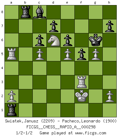Last move : 1/2-1/2 2024 January 3 22:30:42 [Event "FICGS__CHESS__RAPID_A__000298"] [Site "FICGS"] [Date "2023.10.07"] [Round "1"] [White "Swiatek,Janusz"] [Black "Pacheco,Leonardo"] [Result "1/2-1/2"] [WhiteElo "2209"] [BlackElo "1900"] 1.e4 c5 2.Nf3 e6 3.d4 cxd4 4.Nxd4 Nf6 5.Nc3 Nc6 6.Nxc6 bxc6 7.e5 Nd5 8.Ne4 Qc7 9.f4 Qb6 10.c4 Ne3 11.Qd3 Bb4+ 12.Bd2 O-O 13.Rc1 a5 14.Bxb4 Qxb4+ 15.Qd2 f5 16.Nd6 Rb8 17.Rc3 Nxf1 18.Rxf1 Qxb2 19.Qxb2 Rxb2 20.Ra3 Bb7 21.Rxa5 Rb8 22.c5 Rxg2 23.Rf2 Rg1+ 24.Ke2 Bc8 25.Ke3 g5 26.fxg5 Kg7 27.Rf3 Kg6 28.Kf2 Ra1 1/2-1/2 Follow this game move after move (download)Before the endgame, the Gods have placed the middle game. (Siegbert Tarrasch) Rauchen ist dem Schachspieler bei seiner Arbeit, also im Wettkampf, untersagt. (Viktor Kortschnoi) Robert Fischer es la ley hacia si mismo. (Larry Evans) Tout change constamment, y compris dans le monde des Echecs. (Botvinnik) Perhaps chess is the wrong game for the times (The Chess Master and the Computer, by Garry Kasparov - 2010)