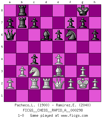 Last move : 1-0 2024 January 25 11:49:48 [Event "FICGS__CHESS__RAPID_A__000298"] [Site "FICGS"] [Date "2023.10.07"] [Round "1"] [White "Pacheco,Leonardo"] [Black "Ramirez,Eliecer"] [Result "1-0"] [WhiteElo "1900"] [BlackElo "2040"] 1.d4 Nf6 2.c4 e6 3.g3 d5 4.Bg2 Be7 5.Nf3 O-O 6.O-O dxc4 7.Ne5 Nc6 8.Nxc6 bxc6 9.Bxc6 Rb8 10.Nc3 Bb7 11.Bxb7 Rxb7 12.e4 Qd7 13.Qe2 Qxd4 14.Rd1 Qc5 15.Be3 Qa5 16.Rd2 Rfb8 17.Rc1 h6 18.Kg2 Qa6 19.R1c2 Bd6 20.b3 1-0 This chess game has been lost on time (started : 2023.10.07 21:18:17) Follow this game move after move (download)I played Chess with him and would have beaten him sometimes only he always took back his last move, and ran the game out differently. (Mark Twain) Gewöhnliche Menschen denken nur daran, wie sie ihre Zeit verbringen. Ein intelligenter Mensch versucht, sie auszunutzen. (Arthur Schopenhauer) Por tratar de evitar la pérdida de una pieza, muchas personas han perdido una partida de Ajedrez. (Savielly Tartakover) Le thème de l'attaque double intervient d'une manière ou d'une autre dans l'immense majorité des combinaisons. (Youri Averbakh) Macintosh - we might not get everything right, but at least we knew the century was going to end. (Douglas Adams)