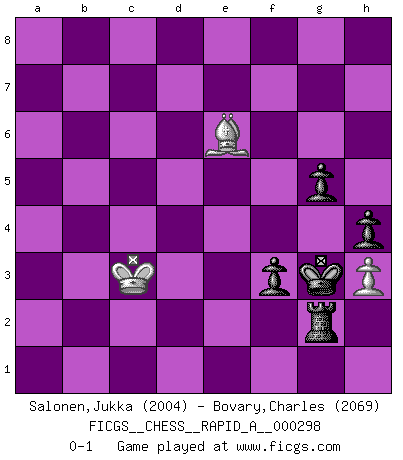 Last move : 0-1 2023 November 25 8:19:43 [Event "FICGS__CHESS__RAPID_A__000298"] [Site "FICGS"] [Date "2023.10.07"] [Round "1"] [White "Salonen,Jukka"] [Black "Bovary,Charles"] [Result "0-1"] [WhiteElo "2004"] [BlackElo "2069"] 1.d4 d5 2.c4 e6 3.Nc3 c5 4.cxd5 cxd4 5.Qa4+ Bd7 6.Qxd4 exd5 7.Qxd5 Nf6 8.Qxb7 Nc6 9.Bf4 Bb4 10.Bc7 Qc8 11.Qxc8+ Rxc8 12.Bf4 Nd4 13.Rc1 Nd5 14.Bd2 Nxc3 15.bxc3 Ba3 16.Rb1 Bf5 17.Rb7 Be4 18.Rxa7 Rb8 19.f3 Nc2+ 20.Kf2 Bc5+ 21.e3 Bxa7 22.fxe4 Rb2 23.Be2 O-O 24.Nf3 Rd8 25.Bc1 Rxa2 26.e5 Ra1 27.Nd4 Nxd4 28.exd4 Rc8 29.Re1 Rxc3 30.Bb2 Rxe1 31.Bxc3 Rc1 32.Bb2 Rc2 33.Ba1 Ra2 34.Bc3 Ra3 35.Bb2 Rb3 36.Ba1 Kf8 37.h3 Bb6 38.Bc4 Rb4 39.Bd3 Bxd4+ 40.Bxd4 Rxd4 41.Ke3 Rd5 42.Ke4 Ra5 43.Bc4 Ke7 44.Kd4 Ra1 45.Ke3 Re1+ 46.Kd4 Rg1 47.Bd5 Rd1+ 48.Kc5 Rd2 49.Kc4 h5 50.Kc5 h4 51.Kc4 f6 52.e6 Kd6 53.e7 Kxe7 54.Bb7 Ke6 55.Kc3 Rd6 56.Bf3 Ke5 57.Kc2 Kf4 58.Kc3 g5 59.Ba8 Kg3 60.Bf3 f5 61.Ba8 Ra6 62.Bd5 Ra1 63.Kb4 Rg1 64.Bc4 Rxg2 65.Be6 f4 66.Kc3 f3 0-1 Follow this game move after move (download)When you don't know what to play, wait for an idea to come into your opponent's mind. You may be sure that idea will be wrong. (Siegbert Tarrasch) Das Schachspiel ist ein See, in welchem eine Mücke baden und ein Elefant ertrinken kann. (Emanuel Lasker) El ganar no lo es todo... pero el perder es nada. (Mednis) Le pion, dans sa simplicité, marche droit devant lui, mais lorsqu'il prend, il le fait obliquement? Ainsi l'homme, tant qu'il reste pauvre, marche dans la droiture et vit honnêtement, mais lorsqu'il recherche les honneurs, il flatte, se parjure et, par les voies obliques, cherche une position supérieure sur l'échiquier du monde. (Jean de Galles) Art disturbs, science reassures. (Georges Braque, Le Jour et la Nuit)