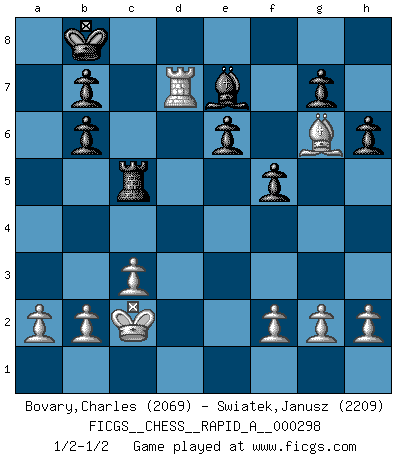 Last move : 1/2-1/2 2023 November 19 12:4:2 [Event "FICGS__CHESS__RAPID_A__000298"] [Site "FICGS"] [Date "2023.10.07"] [Round "1"] [White "Bovary,Charles"] [Black "Swiatek,Janusz"] [Result "1/2-1/2"] [WhiteElo "2069"] [BlackElo "2209"] 1.e4 e6 2.d4 d5 3.Nc3 Nf6 4.Bg5 dxe4 5.Nxe4 Nbd7 6.Nf3 h6 7.Bxf6 Nxf6 8.Bd3 Nxe4 9.Bxe4 c5 10.Qe2 Qa5+ 11.c3 cxd4 12.Nxd4 Qb6 13.O-O-O Bd7 14.Nf3 O-O-O 15.Qc4+ Kb8 16.Ne5 Be8 17.Rxd8+ Qxd8 18.Rd1 Qc7 19.Qb3 Be7 20.Rd4 f6 21.Rc4 Qb6 22.Qxb6 axb6 23.Ng6 Bxg6 24.Bxg6 f5 25.Rd4 Rc8 26.Kc2 Rc5 27.Rd7 1/2-1/2 Follow this game move after move (download)I have always a slight feeling of pity for the man who has no knowledge of Chess. (Siegbert Tarrasch) Herr Iljumschinow ist ein etwas merkwürdiger Geschäftsmann: Er arbeitet zusammen mit Leuten wie Muammar al-Gaddafi; früher ist das Saddam Hussein gewesen. (Joel Lautier) El Jaque al descubierto es el bombardero del tablero. (Reuben Fine) Il (Jacob Murray) ne joue pas pour le bon coup, mais pour le meilleur. (Eloi Relange) No, I am still playing. (Anatoly Karpov)
