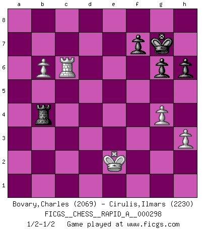 Last move : 1/2-1/2 2023 November 21 14:21:52 [Event "FICGS__CHESS__RAPID_A__000298"] [Site "FICGS"] [Date "2023.10.07"] [Round "1"] [White "Bovary,Charles"] [Black "Cirulis,Ilmars"] [Result "1/2-1/2"] [WhiteElo "2069"] [BlackElo "2230"] 1.e4 d6 2.d4 Nf6 3.Nc3 g6 4.f4 Bg7 5.Nf3 O-O 6.Bd3 Nc6 7.O-O e5 8.d5 Ne7 9.fxe5 dxe5 10.Qe1 c6 11.dxc6 Nxc6 12.Be3 Be6 13.Rd1 h6 14.h3 Qa5 15.Qd2 Kh7 16.g4 Qc7 17.Nb5 Qe7 18.Qf2 b6 19.Qh4 Nb4 20.Nxe5 Bxa2 21.Nf3 Nfd5 22.Qxe7 Nxe7 23.b3 Nec6 24.Nfd4 Rac8 25.Nxc6 Rxc6 26.Nxa7 Nxc2 27.Nxc6 Nxe3 28.Rd2 Nxf1 29.Rxa2 Ne3 30.b4 Rc8 31.b5 Rc7 32.Be2 Rd7 33.Kf2 Nd1+ 34.Bxd1 Rxd1 35.Ra7 Kg8 36.Rb7 Rd2+ 37.Kf1 Bd4 38.Nxd4 Rxd4 39.Rxb6 Rxe4 40.Rc6 Rb4 41.b6 Kg7 42.Ke2 1/2-1/2 Follow this game move after move (download)The passed Pawn is a criminal, who should be kept under lock and key. Mild measures, such as police surveillance, are not sufficient. (Aaron Nimzovich) Ein Remis kann durch Wiederholung von drei Zügen oder durch einen schlechte Zug erreicht werden. (Savielly Grigorievitsch Tartakower) Bendita sea la memoria de aquel que dio al mundo este juego inmortal. (A. G. Gardiner) Il vaut mieux sacrifier les pièces de l'adversaire. (Xavier Tartacover) I would love to change the world, but they won't give me the source code. (Unknown)