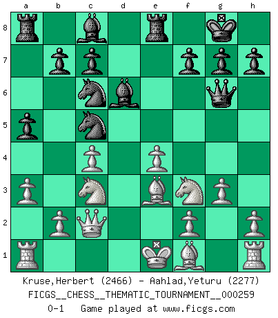 Last move : 0-1 2023 November 13 16:21:13 [Event "FICGS__CHESS__THEMATIC_TOURNAMENT__000259"] [Site "FICGS"] [Date "2023.10.08"] [Round "1"] [White "Kruse,Herbert"] [Black "Aahlad,Yeturu"] [Result "0-1"] [WhiteElo "2466"] [BlackElo "2277"] 1.d4 Nf6 2.c4 e5 3.dxe5 Ne4 4.a3 d6 5.Qc2 Nc5 6.exd6 Bxd6 7.Nc3 O-O 8.Nf3 Qf6 9.e4 a5 10.Bg5 Qg6 11.Be3 Re8 12.g3 Nc6 0-1 Follow this game move after move (download)Life is like a game of Chess, changing with each move. (Chinese proverb) Schach ist ein Reich, wo sich die menschliche Phantasie frei entfalten kann. (David Bronstein) El Ajedrez lo es todo: arte, ciencia y deporte. (Anatoly Karpov) Aux échecs, l'amour-propre est satisfait quand on remporte la victoire, mais il n'y a pas de honte à être battu. (Benjamin Franklin) If we don't succeed, we run the risk of failure. (George W. Bush)