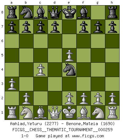 Last move : 1-0 2023 November 16 23:45:57 [Event "FICGS__CHESS__THEMATIC_TOURNAMENT__000259"] [Site "FICGS"] [Date "2023.10.08"] [Round "1"] [White "Aahlad,Yeturu"] [Black "Benone,Mateia"] [Result "1-0"] [WhiteElo "2277"] [BlackElo "1690"] 1.d4 Nf6 2.c4 e5 3.dxe5 Ne4 4.a3 1-0 This chess game has been lost on time (started : 2023.10.08 0:28:17) Follow this game move after move (download)The stomach is an essential part of the Chess master. (Bent Larsen) Drei Punkte vor allen anderen ist wie einer, der im weißen Anzug posiert, während der Rest in Müllsäcke gekleidet dasteht. (Viktor Kortschnoi) Hoy en día, si tu no eres un Gran Maestro a los 14 años, es mejor que lo olvides. (Anand Viswanathan) Il n'y a pas eu de défaite parce que je ne crois pas que cet ordinateur ait jamais existé. IBM a triché en refusant d'imprimer les modes de recherche de la machine. C'est évident, pendant le match, des coups décisifs ont été joués par des êtres humains. Aujourd'hui, les meilleurs spécialistes en informatique ne peuvent toujours pas expliquer comment Deep-Blue a pu jouer contre la logique des ordinateurs. IBM a gagné une guerre de communication, mais ils sont incapables de prouver que l'ordinateur a gagné tout seul. (Garry Kasparov) Rules and bones are meant to be broken. (Anonymous)