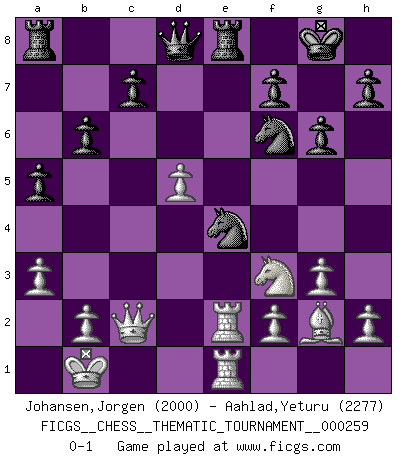 Last move : 0-1 2024 March 6 5:36:3 [Event "FICGS__CHESS__THEMATIC_TOURNAMENT__000259"] [Site "FICGS"] [Date "2023.10.08"] [Round "1"] [White "Johansen,Jorgen"] [Black "Aahlad,Yeturu"] [Result "0-1"] [WhiteElo "2000"] [BlackElo "2277"] 1.d4 Nf6 2.c4 e5 3.dxe5 Ne4 4.a3 d6 5.Qc2 Nc5 6.exd6 Bxd6 7.Nc3 O-O 8.Nf3 Qf6 9.e4 b6 10.Be3 Bb7 11.O-O-O Bf4 12.Re1 Bxe3+ 13.Rxe3 Nbd7 14.Nd5 Qd8 15.g3 Nf6 16.Bg2 Re8 17.Rhe1 a5 18.Kb1 g6 19.R3e2 Bxd5 20.cxd5 Ncxe4 0-1 Follow this game move after move (download)When you see a good move, look for a better one. (Emanuel Lasker) Der Freibauer hat für mich eine Seele, genau wie der Mensch, Wünsche, die unerkannt in ihm schlummern, und Befürchtungen, von deren Existenz er selbst kaum ahnt. (Aaron Nimzowitsch) El Ajedrez es parte de la cultura, y si una cultura esta en decadencia, entonces también el Ajedrez declinará. (Mikhail Botvinnik) Une platitude souvent récitée à propos des Echecs est qu'une des choses les plus difficiles à réaliser est de gagner une position gagnante. Cela ne manque pas de sens mais, pour ma part, j'ai toujours trouvé plus difficile de gagner une position perdante. (Tim Krabbe) Luck is what you have left over after you give 100 percent. (Langston Coleman)