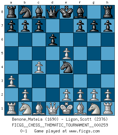 Last move : 0-1 2023 November 17 14:30:43 [Event "FICGS__CHESS__THEMATIC_TOURNAMENT__000259"] [Site "FICGS"] [Date "2023.10.08"] [Round "1"] [White "Benone,Mateia"] [Black "Ligon,Scott"] [Result "0-1"] [WhiteElo "1690"] [BlackElo "2376"] 1.d4 Nf6 2.c4 e5 3.dxe5 Ne4 4.a3 d6 0-1 This chess game has been lost on time (started : 2023.10.08 0:28:17) Follow this game move after move (download)The enormous mental resilience, without which no Chess player can exist, was so much taken up by Chess that he could never free his mind of this game. (Albert Einstein) Mein erstes Ziel war nicht, die Partie zu gewinnen, sondern eine Figur zu opfern. -- der junge (Wilhelm Steinitz) El ganar no lo es todo... pero el perder es nada. (Mednis) Votre seul travail dans les ouvertures est d'obtenir un milieu de partie jouable. (Lajos Portish) The hypothalamus is one of the most important parts of the brain, involved in many kinds of motivation, among other functions. The hypothalamus controls the 'Four Fs: Fighting, Fleeing, Feeding and Mating. (Unknown author)