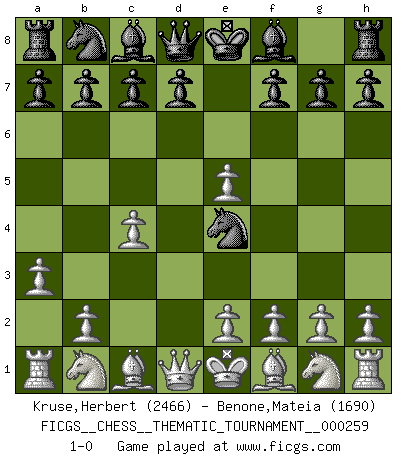 Last move : 1-0 2023 November 16 23:45:57 [Event "FICGS__CHESS__THEMATIC_TOURNAMENT__000259"] [Site "FICGS"] [Date "2023.10.08"] [Round "1"] [White "Kruse,Herbert"] [Black "Benone,Mateia"] [Result "1-0"] [WhiteElo "2466"] [BlackElo "1690"] 1.d4 Nf6 2.c4 e5 3.dxe5 Ne4 4.a3 1-0 This chess game has been lost on time (started : 2023.10.08 0:28:17) Follow this game move after move (download)Place the contents of the Chess box in a hat, shake them up vigorously, pour them on the board from a height of two feet, and you get the style of Steinitz. (H. E. Bird) Spiel ein langweiliges Spiel zu Ende und lustige Dinge können passieren. (Hans Ree) En la vida, como en el Ajedrez, los Peones propios obstruyen nuestro camino. La gran fortuna de un hombre, su comodidad, placer, hijos, libros, que deberían ayudarle a ganar, con mucha frecuencia lo ponen en Jaque Mate. (Charles Buxton) La tactique, c'est ce que vous faites quand il y a quelque chose à faire; la stratégie, c'est ce que vous faites quand il n'y a rien à faire. (Savielli Tartacower) A shortcut is the longest distance between two points. (Don Groves)