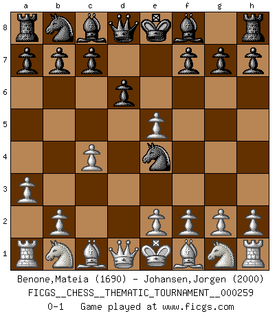 Last move : 0-1 2023 November 17 14:30:43 [Event "FICGS__CHESS__THEMATIC_TOURNAMENT__000259"] [Site "FICGS"] [Date "2023.10.08"] [Round "1"] [White "Benone,Mateia"] [Black "Johansen,Jorgen"] [Result "0-1"] [WhiteElo "1690"] [BlackElo "2000"] 1.d4 Nf6 2.c4 e5 3.dxe5 Ne4 4.a3 d6 0-1 This chess game has been lost on time (started : 2023.10.08 0:28:17) Follow this game move after move (download)Fischer sacrificed virtually everything most of us weakies (to use his term) value, respect, and cherish, for the sake of an artful, often beautiful board game, for the ambivalent privilege of being its greatest master. (Paul Kollar) Mit sehr nachdenklichem Gesicht schreitet Bobby durch den Turniersaal. Was ist passiert?, fragt Lombardy. Ich stehe schlecht, antwortet Fischer. Lombardy: Dann biete doch einfach Remis an. Fischer: So schlecht stehe ich nun auch wieder nicht! (Robert James Fischer) En el Ajedrez, tal como es jugado por los Maestros, practicamente la suerte es eliminada. (Emanuel Lasker) Le jeu d'échecs fait naître et fortifie en nous plusieurs qualités précieuses dans le cours de l'existence, telles que la prévoyance, la circonspection, la prudence, et la persévérance. (Benjamin Franklin - 1783, la morale des échecs) When you stop learning you start dying. (Scott Adams)