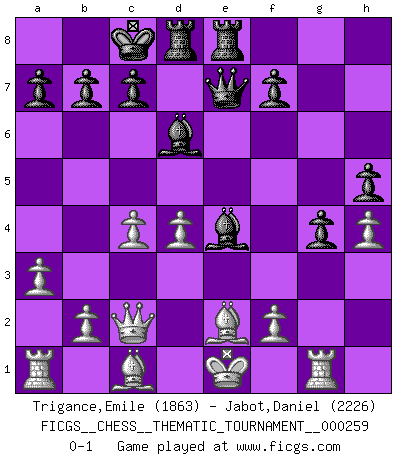 Last move : 0-1 2024 February 25 9:55:55 [Event "FICGS__CHESS__THEMATIC_TOURNAMENT__000259"] [Site "FICGS"] [Date "2023.10.08"] [Round "1"] [White "Trigance,Emile"] [Black "Jabot,Daniel"] [Result "0-1"] [WhiteElo "1863"] [BlackElo "2226"] 1.d4 Nf6 2.c4 e5 3.dxe5 Ne4 4.a3 d6 5.Nd2 Bf5 6.Ngf3 dxe5 7.Nxe5 Bd6 8.Nef3 Nc6 9.Nxe4 Bxe4 10.e3 Qe7 11.Be2 O-O-O 12.Qa4 g5 13.h3 h5 14.h4 g4 15.Nd4 Nxd4 16.exd4 Bxg2 17.Rg1 Rhe8 18.Qc2 Be4 0-1 Follow this game move after move (download)A passed Pawn increases in strength as the number of pieces on the board diminishes. (Capablanca) Obwohl ich vom Stil her kaum zu den Priestern der Schachkunst gezählt werde, halte ich Schach doch für eine Kunst. (Tigran Petrosjan) Durante una competencia de Ajedrez, un Maestro de Ajedrez deberá ser una combinación de presa de caza y un Monge. (Alexander Alekhine) La menace est plus forte que l'exécution. (Aaron Nimzovitch) There are two major products that came out of Berkeley: LSD and UNIX. We do not believe this is to be a coincidence. (Jeremy S. Anderson)