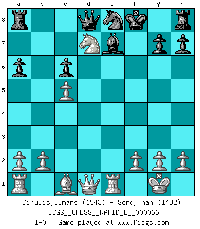 Last move : 1-0 2007 October 15 17:6:14 [Event "FICGS__CHESS__RAPID_B__000066"] [Site "FICGS"] [Date "2007.09.10"] [Round "1"] [White "Cirulis,Ilmars"] [Black "Serd,Than"] [Result "1-0"] [WhiteElo "1543"] [BlackElo "1432"] 1.d4 d5 2.c4 e6 3.e3 Nf6 4.Nf3 c5 5.cxd5 exd5 6.Nc3 Nc6 7.Bb5 a6 8.Bxc6+ bxc6 9.O-O Bd7 10.Re1 Bd6 11.e4 dxe4 12.Nxe4 Be7 13.Nd6+ Kf8 14.dxc5 Ne8 15.Nxf7 Kxf7 16.Ne5+ Kf8 17.Nxd7+ 1-0 Queen's gambit declined Kingside Castling by player White (move 9) Player White won this chess game. Follow this game move after move (download)Chess is a fighting game which is purely intellectual and includes chance. (Richard Reti) Im Leben werden Partien nie so unstrittig gewonnen wie im Spiel (Emanuel Lasker) No es tiempo de jugar al Ajedrez cuando la casa esta en llamas. (Proverbio Italiano) L'ordinateur a tué l'originalité. Il n'y a plus guère d'aventures sur l'échiquier. (Jacob Murray) Philosophers use a language that is already deformed as though by shoes that are too tight. (Ludwig Wittgenstein)