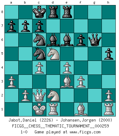 Last move : 1-0 2024 February 24 0:51:18 [Event "FICGS__CHESS__THEMATIC_TOURNAMENT__000259"] [Site "FICGS"] [Date "2023.10.08"] [Round "1"] [White "Jabot,Daniel"] [Black "Johansen,Jorgen"] [Result "1-0"] [WhiteElo "2226"] [BlackElo "2000"] 1.d4 Nf6 2.c4 e5 3.dxe5 Ne4 4.a3 d6 5.Qc2 Nc5 6.exd6 Bxd6 7.Nf3 Qf6 8.Nc3 Nc6 9.e4 Bg4 10.Be3 O-O-O 11.Nd5 Qg6 12.Nd2 Rhe8 13.f3 Be6 14.g4 h5 15.g5 f5 16.gxf6 gxf6 17.O-O-O 1-0 This chess game has been lost on time (started : 2023.10.08 0:28:17) Follow this game move after move (download)After a bad opening, there is hope for the middle game. After a bad middle game, there is hope for the endgame. But once you are in the endgame, the moment of truth has arrived. (Edmar Mednis) Nur ein wirklich starker Spieler weiß wie schwach er spielt. (Savielly Grigorievitsch Tartakower) Es el objetivo de la escuela moderna no tratar cada posición de acuerdo a una regla general, sino de acuerdo al principio inherente en la posición. (Richard Reti) Je ne suis pas le dernier à jouer lâchement des coups douteux pendant le zeïtnot de l'adversaire pour l'achever: en effet les coups qui font le plus peur sont ceux que l'on ne comprend pas. Je me fais souvent peur quand je joue. (Un professeur anonyme) See no evil, hear no evil, speak no evil. (The 3 monkeys)