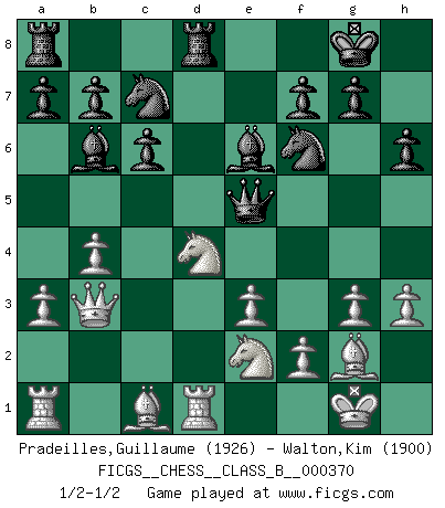 Last move : 1/2-1/2 2023 December 10 11:16:46 [Event "FICGS__CHESS__CLASS_B__000370"] [Site "FICGS"] [Date "2023.10.11"] [Round "1"] [White "Pradeilles,Guillaume"] [Black "Walton,Kim"] [Result "1/2-1/2"] [WhiteElo "1926"] [BlackElo "1900"] 1.c4 e5 2.g3 c6 3.Nf3 e4 4.Nd4 d5 5.cxd5 Qxd5 6.e3 Nf6 7.Nc3 Qe5 8.Bg2 Bc5 9.d3 exd3 10.Qxd3 O-O 11.O-O Rd8 12.h3 h6 13.Rd1 Bb6 14.b4 Na6 15.a3 Nc7 16.Nce2 Bf5 17.Qb3 Be6 18.Qd3 Bf5 19.Qb3 Be6 1/2-1/2 Follow this game move after move (download)Chess is a terrific way for kids to build self image and self esteem. (Saudin Robovic) Das Schachspiel ist ein See, in welchem eine Mücke baden und ein Elefant ertrinken kann. (Emanuel Lasker) El jugador blanco perdió porque fallo en recordar la coreccta continuación y tuvo que pensar por sí mismo las movidas. (Siegbert Tarrasch) Il n'y a pas eu de défaite parce que je ne crois pas que cet ordinateur ait jamais existé. IBM a triché en refusant d'imprimer les modes de recherche de la machine. C'est évident, pendant le match, des coups décisifs ont été joués par des êtres humains. Aujourd'hui, les meilleurs spécialistes en informatique ne peuvent toujours pas expliquer comment Deep-Blue a pu jouer contre la logique des ordinateurs. IBM a gagné une guerre de communication, mais ils sont incapables de prouver que l'ordinateur a gagné tout seul. (Garry Kasparov) Games, world of games... There's always an opponent, and there's always a victim. (Revolver, movie)
