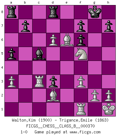 Last move : 1-0 2024 March 12 16:41:10 [Event "FICGS__CHESS__CLASS_B__000370"] [Site "FICGS"] [Date "2023.10.11"] [Round "1"] [White "Walton,Kim"] [Black "Trigance,Emile"] [Result "1-0"] [WhiteElo "1900"] [BlackElo "1863"] 1.d4 Nf6 2.c4 e6 3.Nc3 Bb4 4.e3 O-O 5.Nge2 d5 6.a3 Be7 7.cxd5 exd5 8.Nf4 c6 9.Bd3 a5 10.O-O Na6 11.f3 Nc7 12.Bd2 c5 13.dxc5 Bxc5 14.Kh1 Re8 15.e4 d4 16.Nce2 Ne6 17.Qc2 Nd7 18.Bb5 Bb6 19.Nd5 Rf8 20.Rac1 Ndc5 21.Bc4 Bd7 22.Ng3 Bc6 23.Nf5 Bxd5 24.exd5 Nc7 25.d6 N7e6 26.b4 d3 27.Qb2 Qf6 28.Qxf6 gxf6 29.bxc5 Bxc5 30.Rc3 Rfd8 31.Bxe6 1-0 Follow this game move after move (download)It is peculiar but a fact nevertheless, that gamblers in chess always have enthusiastic followers. (Botvinnik) Die FIDE ist dabei in die Hände der russischen Mafia zu fallen. (Larry Evans) Cuando no sepas que mover, espera por una idea que se le venga a la la cabeza de tu oponente. Tenlo por seguro de que esa idea estará incorrecta. (Siegbert Tarrasch) Mon pion favori sur ma case favorite ! Bronstein en parlant d'un coup de pion en h5 quand il avait les Noirs. I'm extremely disappointed. I send you out for exciting, new designer drugs, you come back with tomato sauce. (Gregory House, House M.D.)