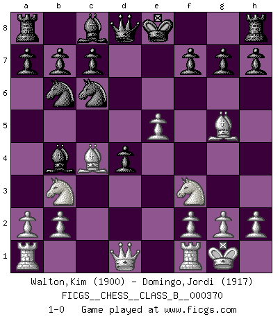 Last move : 1-0 2023 December 2 3:3:5 [Event "FICGS__CHESS__CLASS_B__000370"] [Site "FICGS"] [Date "2023.10.11"] [Round "1"] [White "Walton,Kim"] [Black "Domingo,Jordi"] [Result "1-0"] [WhiteElo "1900"] [BlackElo "1917"] 1.d4 d5 2.c4 dxc4 3.e4 e5 4.Nf3 exd4 5.Bxc4 Bb4+ 6.Nbd2 Nc6 7.O-O Nf6 8.e5 Nd5 9.Nb3 Nb6 10.Bg5 1-0 This chess game has been lost on time (started : 2023.10.11 22:32:40) Follow this game move after move (download)The essence of Chess is thinking about what Chess is. (David Bronstein) Schach ist ein Kampf gegen den Fehler. (Johannes Herrman Zukertort) Un juego de Ajedrez es un dialogo, una conversación entre un jugador y su oponente. Cada movimiento del oponente puede contener amenazas o tropiezos, pero un jugador no se puede defender de las amenazas o tomar ventaja de los tropiezos si es que no se pregunta a sí mismo: ¿Que es lo que mi oponente va a hacer después de cada movida?. (Bruce A. Moon) On est toujours la mazette de quelqu'un d'autre. (Anonyme) Luck has a peculiar habit of favoring those who don't depend on it. (Author unknown)