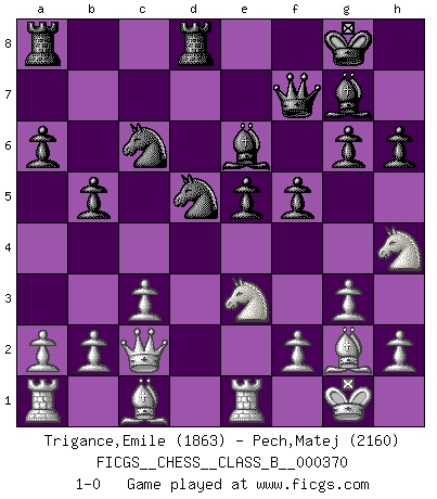 Last move : 1-0 2024 March 2 9:1:38 [Event "FICGS__CHESS__CLASS_B__000370"] [Site "FICGS"] [Date "2023.10.11"] [Round "1"] [White "Trigance,Emile"] [Black "Pech,Matej"] [Result "1-0"] [WhiteElo "1863"] [BlackElo "2160"] 1.e4 d5 2.exd5 Nf6 3.d4 Nxd5 4.c3 c5 5.Nf3 cxd4 6.Nxd4 a6 7.Bd3 g6 8.O-O Bg7 9.Re1 O-O 10.Bf1 Qc7 11.g3 Rd8 12.Qb3 e5 13.Nf3 Nc6 14.Nbd2 b5 15.Bg2 h6 16.Nf1 Be6 17.Qc2 f5 18.Nh4 Qf7 19.Ne3 1-0 This chess game has been lost on time (started : 2023.10.11 22:32:40) Follow this game move after move (download)Different people feel differently about resigning. (Bobby Fischer) Als er Schachweltmeister wurde ließ er praktisch alle stärksten Sovietspieler für sich arbeiten. Wenn ein auch nur mittelmässiger Meister ein Spezialist für eine bestimmte Eröffnung war, wurde er von Karpov gerufen. Das wurde alles geheim gehalten. (Mikhail Moiseyevich Botvinik) Cuando tu casa esta en llamas, no puedes ser molestado por tus vecinos. O, como decinos en Ajedrez, si tu Rey esta bajo ataque, no te preocupa perder un Peón del lado de la Reina. (Gary Kasparov) Le système Elo représente seulement une moyenne. Il est simplement un indicateur de votre stabilité. (Anatoli Karpov) Life is pain my dear and anyone who says otherwise is selling something. (Princess Bride)