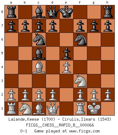 Last move : 0-1 2007 October 15 12:47:11 [Event "FICGS__CHESS__RAPID_B__000066"] [Site "FICGS"] [Date "2007.09.10"] [Round "1"] [White "Lalande,Keese"] [Black "Cirulis,Ilmars"] [Result "0-1"] [WhiteElo "1700"] [BlackElo "1543"] 1.e4 e5 2.Nf3 Nc6 3.Bc4 Bc5 4.O-O Nf6 0-1 This chess game has been lost on time (started : 2007.09.10 6:41:18) Giuoco Piano Kingside Castling by player White (move 4) Player Black won this chess game. Follow this game move after move (download)The battle for the ultimate truth will never be won. And that's why Chess is so fascinating. (Hans Kmoch) Es hat in meinem Leben Zeiten gegeben, da ich sehr nahe daran war zu glauben, daß ich auch nicht eine einzige Schachpartie verlieren könnte. (José Raúl Capablanca) Existen dos clases de sacrificios: los correctos y los míos. (Mikhail Tal) Dans le domaine de la peinture, de la gravure et de la sculpture, dès la première décennie de notre siècle, les artistes abandonnent la représentation de la partie d'échecs pour se concentrer sur les pièces, sur les échiquiers et sur toutes les variations auxquelles les unes et les autres peuvent donner lieu. On passe en quelque sorte d'un thème social à un thème musical (au sens de la musica médiévale, c'est-à-dire d'une notion qui inclue le rythme, l'harmonie, la construction et la déconstruction, etc.). Graphiquement et picturalement, l'échiquier apparaît comme une structure ouverte, dynamique, d'une richesse infinie, autorisant toutes les combinatoires et débouchant sur des mouvements et des rythmes de nature exponentielle. (Michel Pastoureau) Mandala - that's it! 16x16 squares as multiple of the four and the eight because of the Four Noble Truths and the Noble Eightfold Path. (Heinz-Georg Lehnhoff about Big Chess)