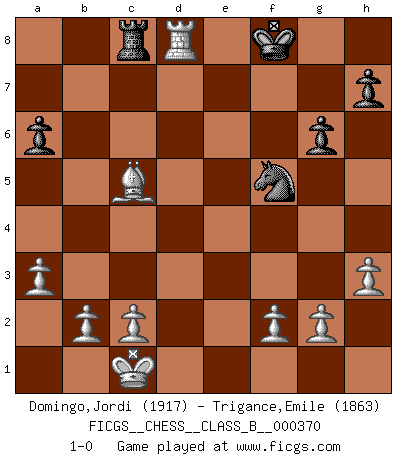 Last move : 1-0 2024 March 17 18:33:32 [Event "FICGS__CHESS__CLASS_B__000370"] [Site "FICGS"] [Date "2023.10.11"] [Round "1"] [White "Domingo,Jordi"] [Black "Trigance,Emile"] [Result "1-0"] [WhiteElo "1917"] [BlackElo "1863"] 1.e4 e5 2.Nf3 d6 3.d4 Nf6 4.dxe5 Nxe4 5.Qd5 Nc5 6.Bg5 Qd7 7.exd6 Bxd6 8.Nc3 O-O 9.O-O-O Nc6 10.Be3 Ne7 11.Qd2 b6 12.Bb5 Qg4 13.h3 Qb4 14.Rhe1 a6 15.a3 Qa5 16.Bc4 Ne6 17.Ne4 Qxd2+ 18.Rxd2 Rd8 19.Nxd6 cxd6 20.Bxb6 Rd7 21.Rxe6 fxe6 22.Bxe6+ Kf8 23.Bxd7 Bxd7 24.Rxd6 Bf5 25.Nd4 g6 26.Bc5 Rc8 27.Nxf5 Nxf5 28.Rd8+ 1-0 Follow this game move after move (download)Chess is 99 percent tactics. (Teichmann) Mein erstes Ziel war nicht, die Partie zu gewinnen, sondern eine Figur zu opfern. -- der junge (Wilhelm Steinitz) No hay otro maestro que tenga una voluntad terrífica de ganar. Al tablero, el irradía peligro y aún los oponentes mas fuertes tienden a congelarse como liebres cuando olfatean a una pantera. Aún sus debilidades son peligrosas. Con las blancas, su juego de apertura es predecible - te es posible hacer planes en su contra - pero es tan fuerte que tus planes casi nunca funcionan. En el juego medio, su precisión e invención son fabulosas y en finales, tú simplemente no le puedes vencer. (Experto Alemán anónimo) Je menace de comprendre la position. (Anonyme) Life is the sum of all your choices. (Albert Camus)